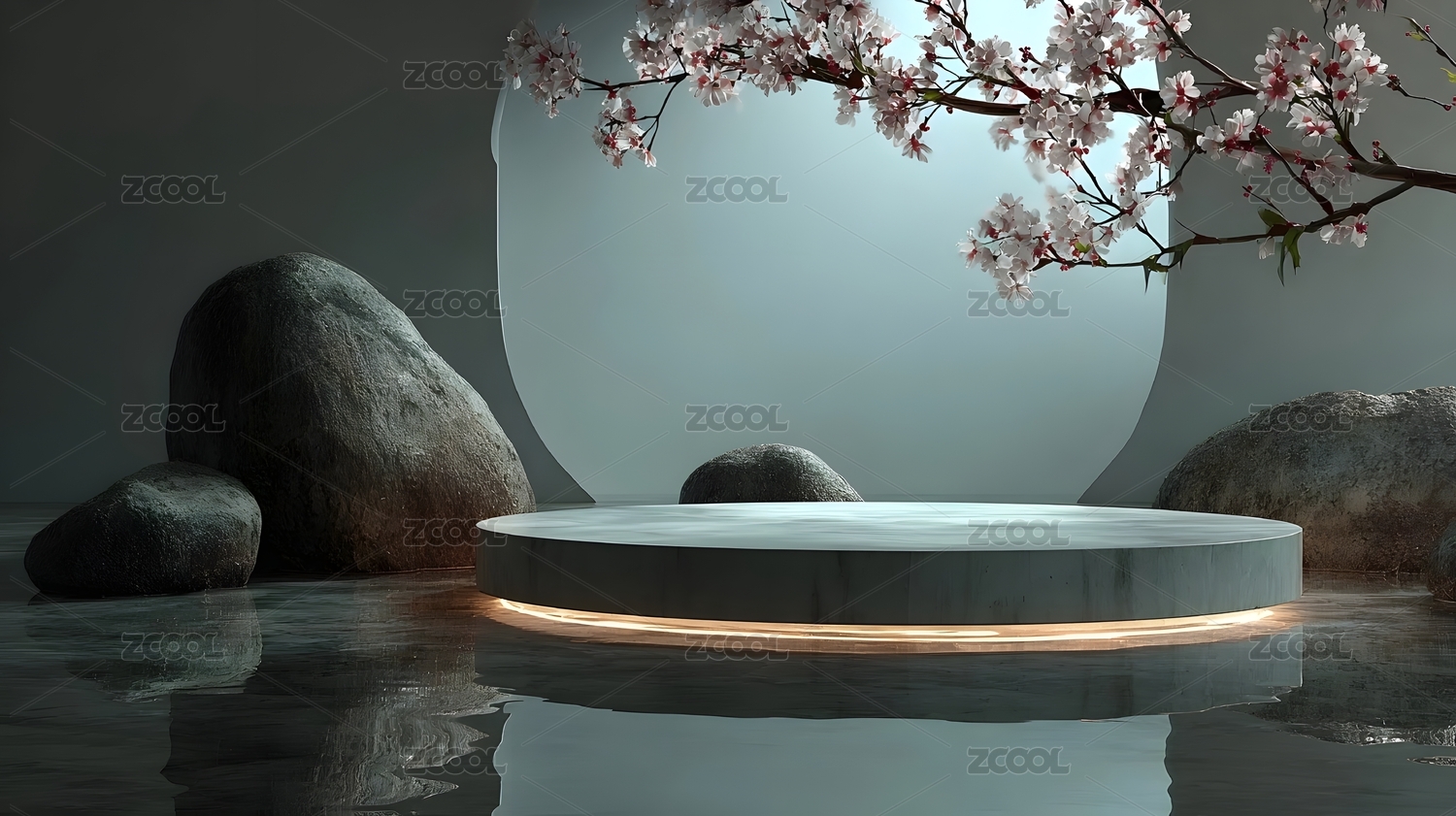 水中圆台与粉色花枝