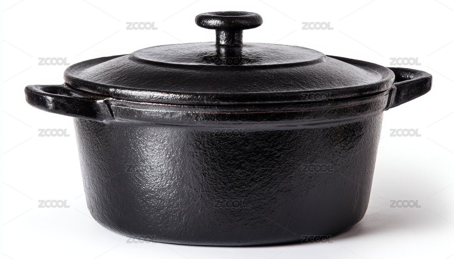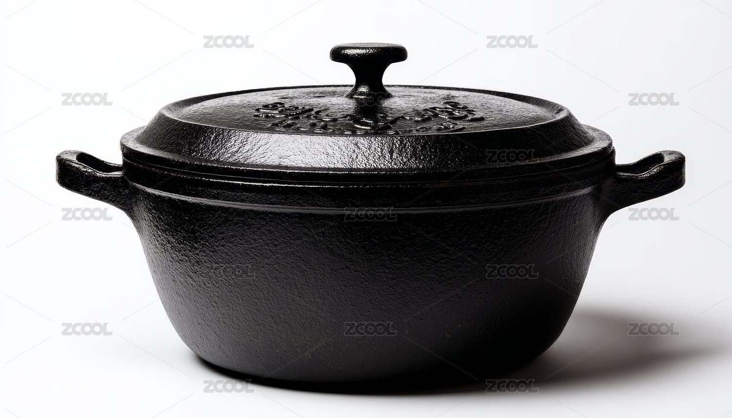 桌子上着一个黑色的锅背景是灰色的高清图片
