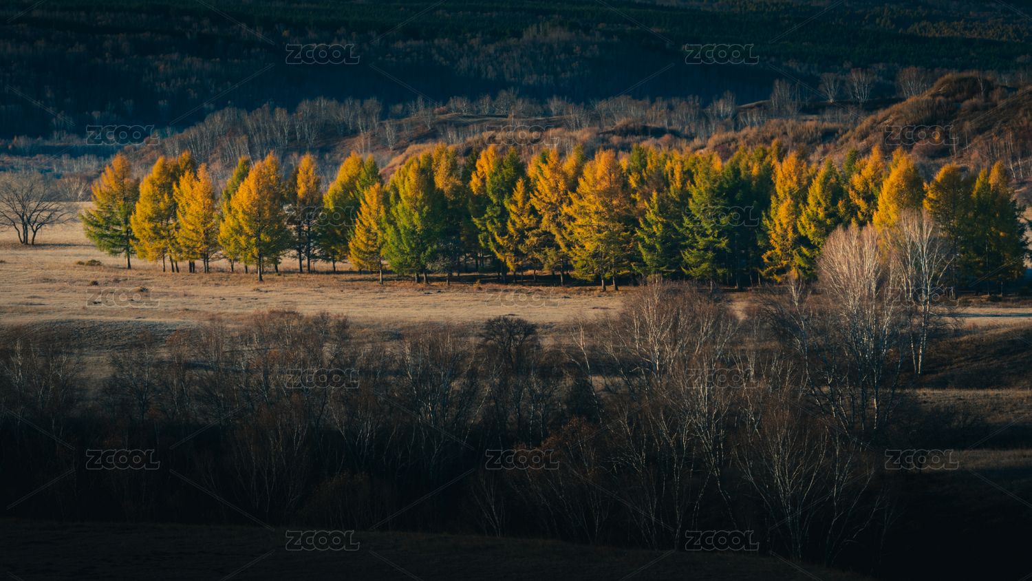 秋季内蒙古多沦湖景区里草原上的金黄色的树林