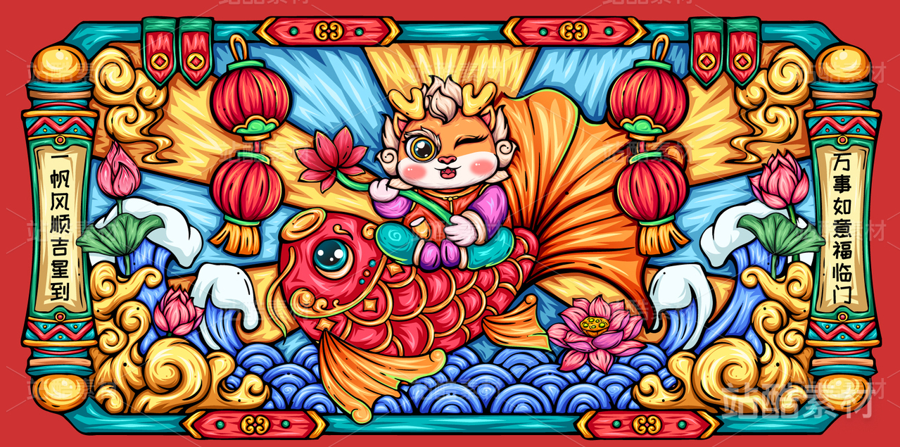 龙年锦鲤聚宝盆红色新年喜庆传统纹样边框