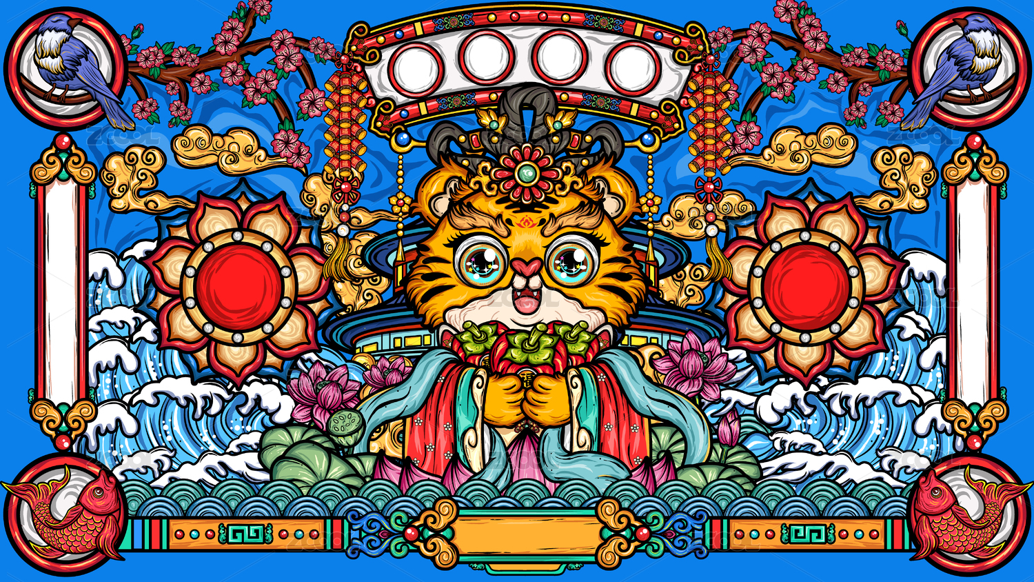 老虎,虎年,新年,聚宝盆,金子,灯笼,荷花,浪花,祥云,国潮