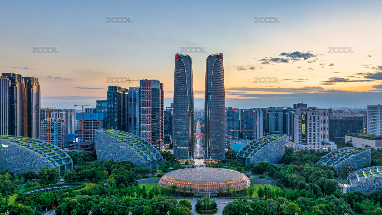 俯瞰晚霞时分的成都金融城双子塔及周边建筑