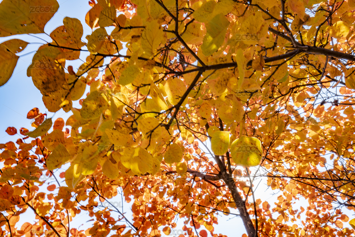 在枫叶林中仰拍的枫树枝叶