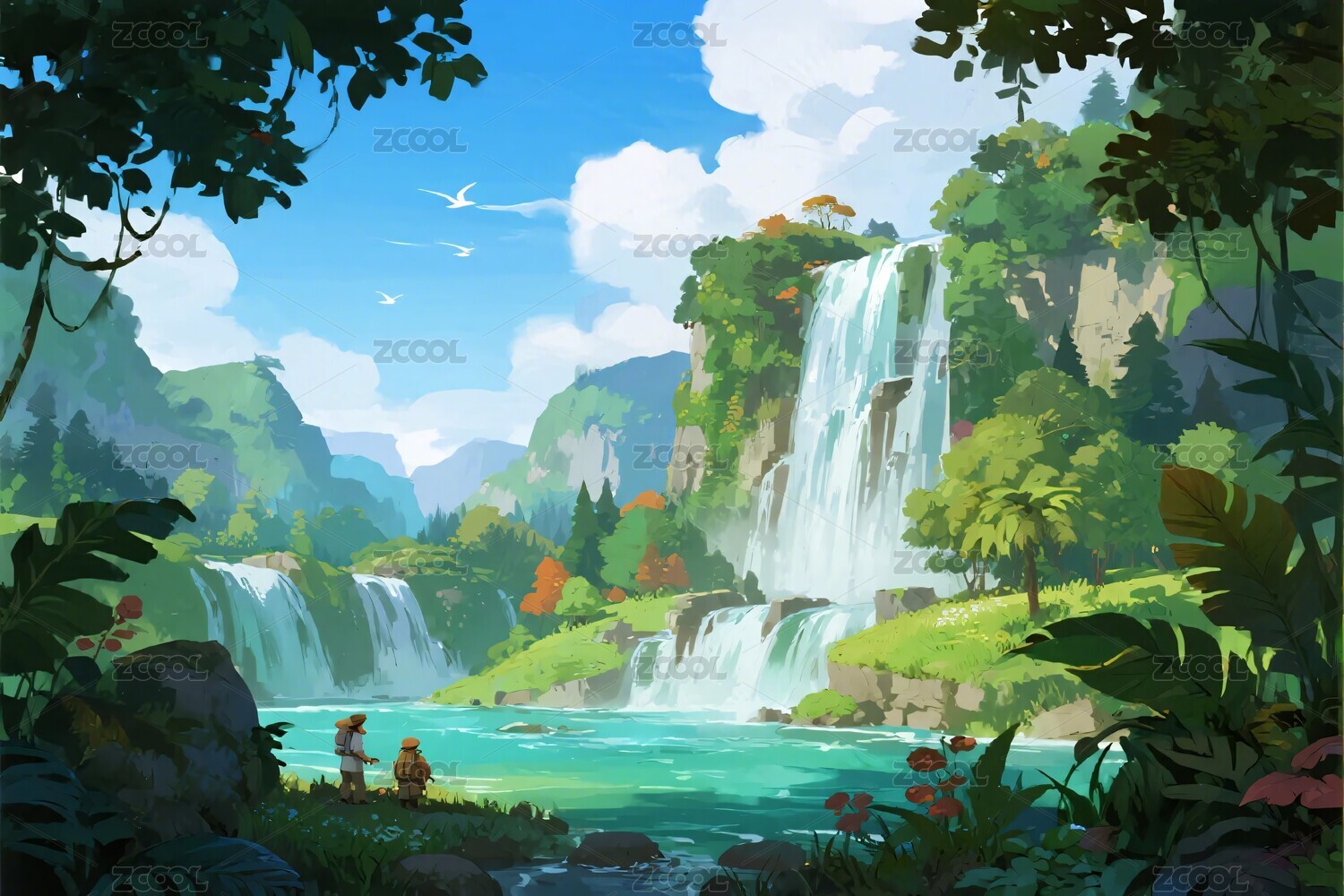 热带瀑布景观插画
