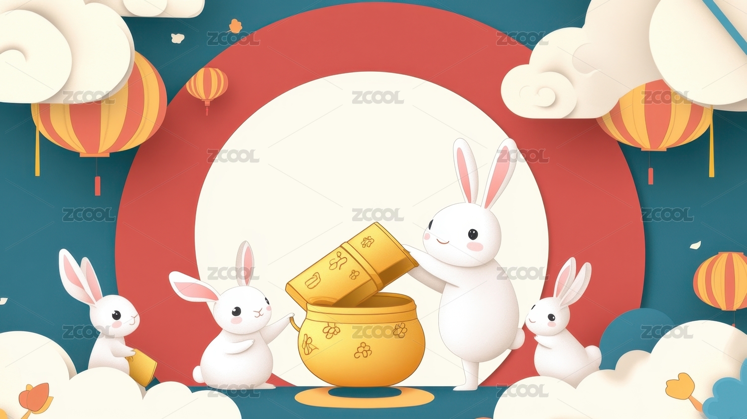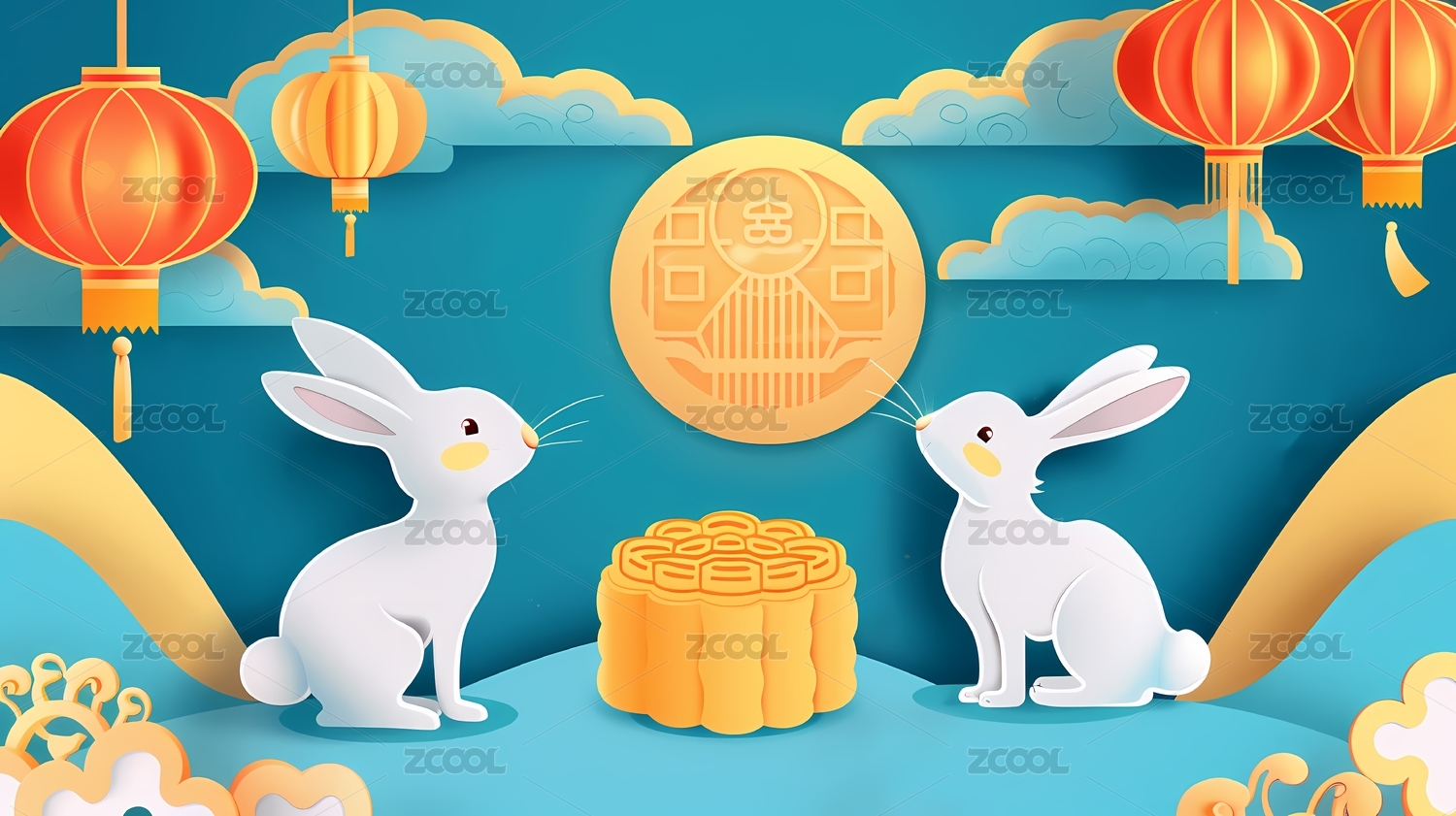 中秋节剪纸风玉兔与满月灯笼插画背景
