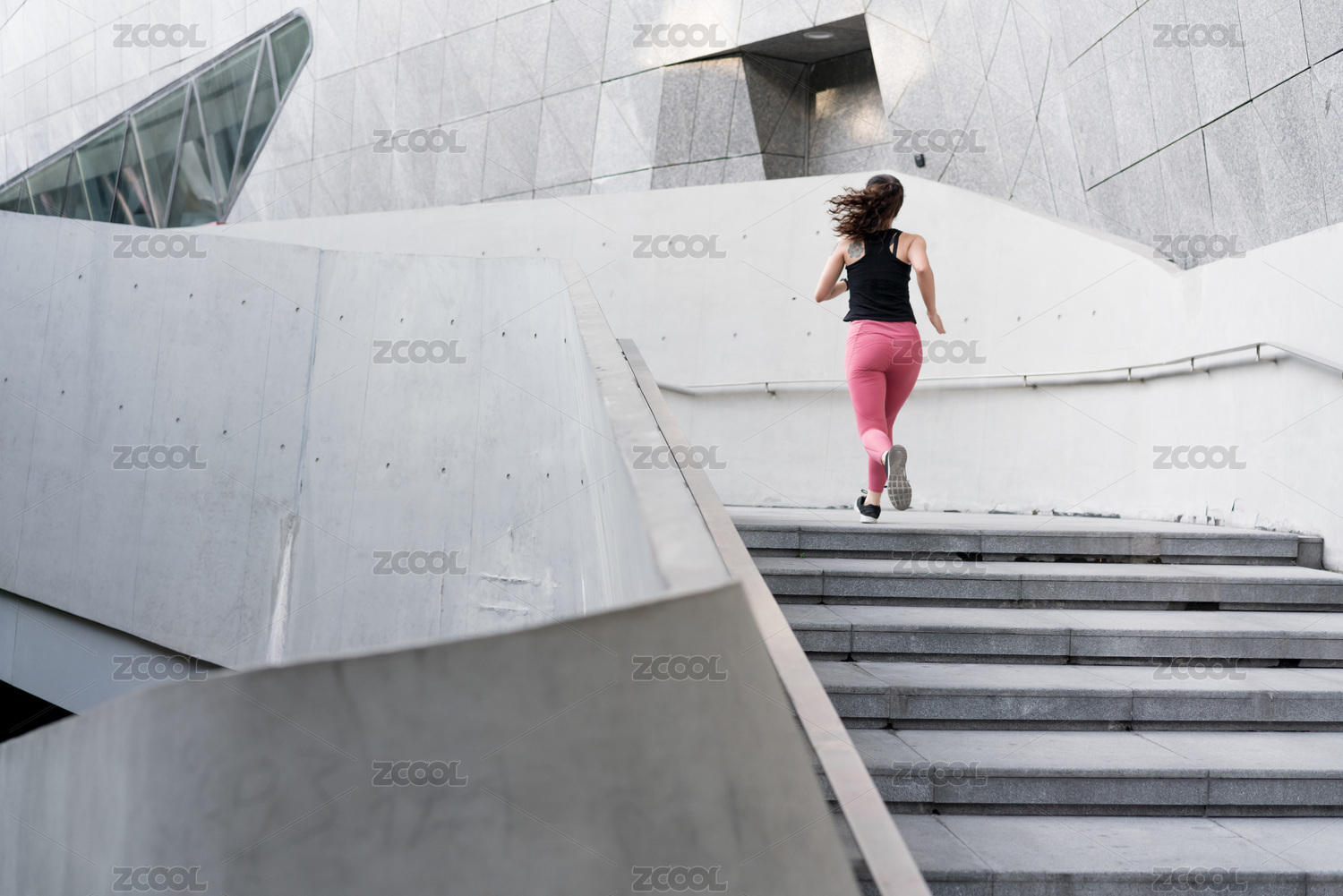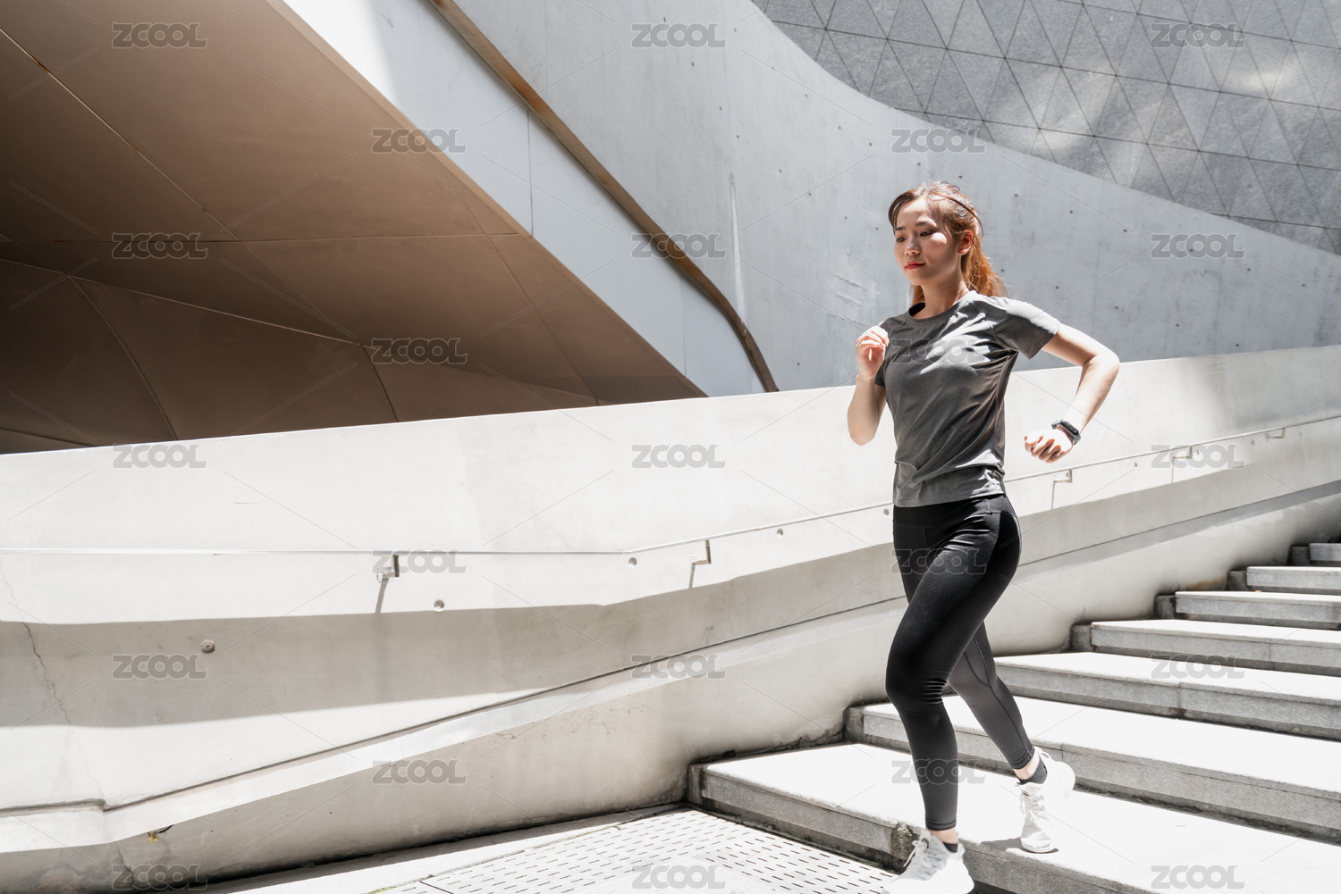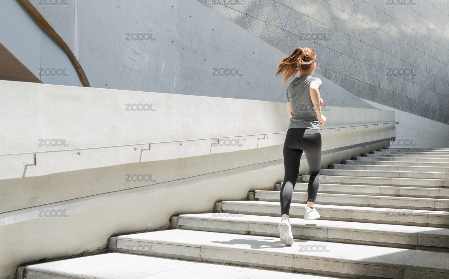 优雅的年轻女性慢跑慢跑在城市公园区锻炼灰色背景人行道个人健康和健身通过马拉松路上跑。