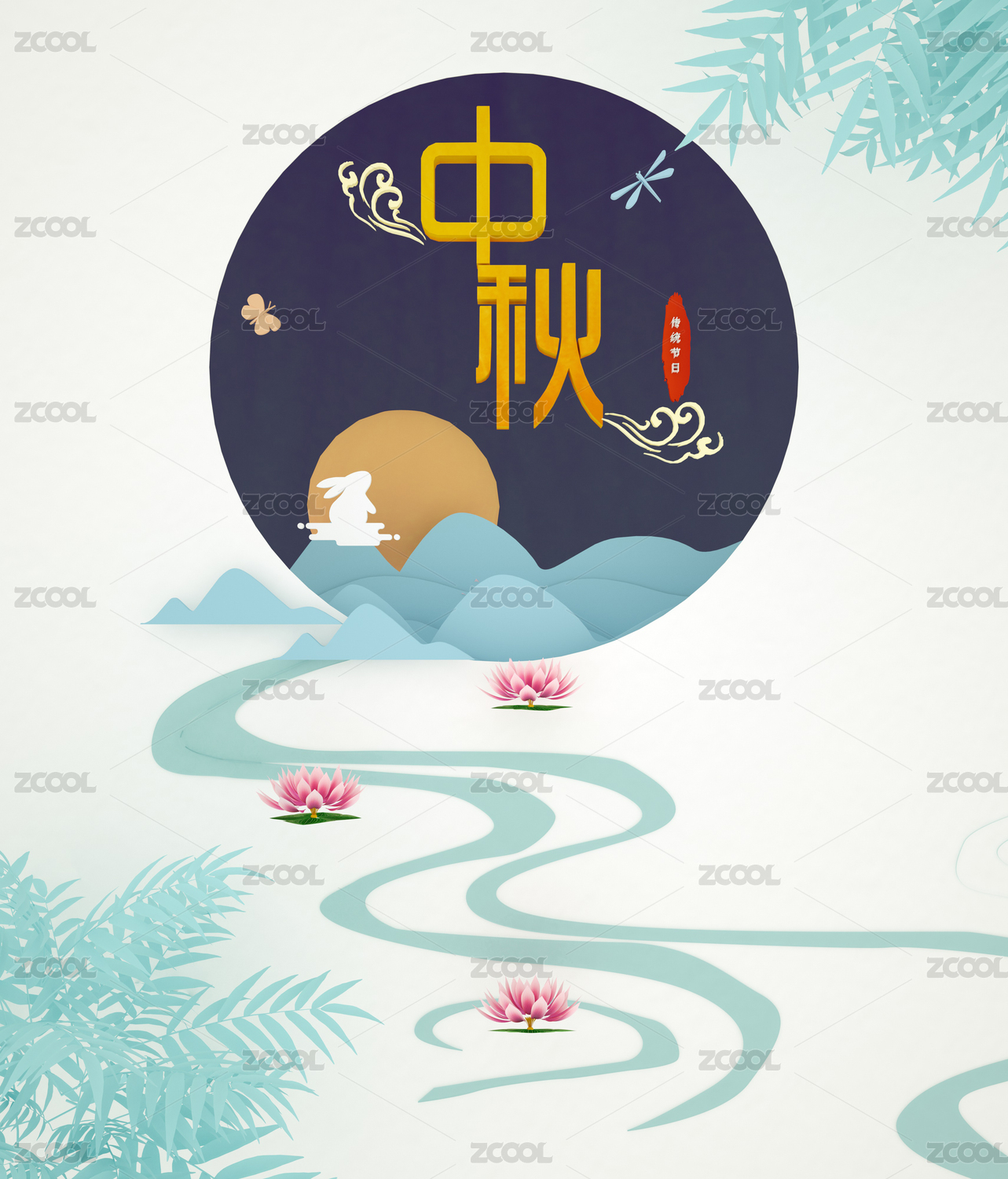 中秋节,中秋,月亮,桂花,山丘,山脉,山,荷花,水纹,祥云