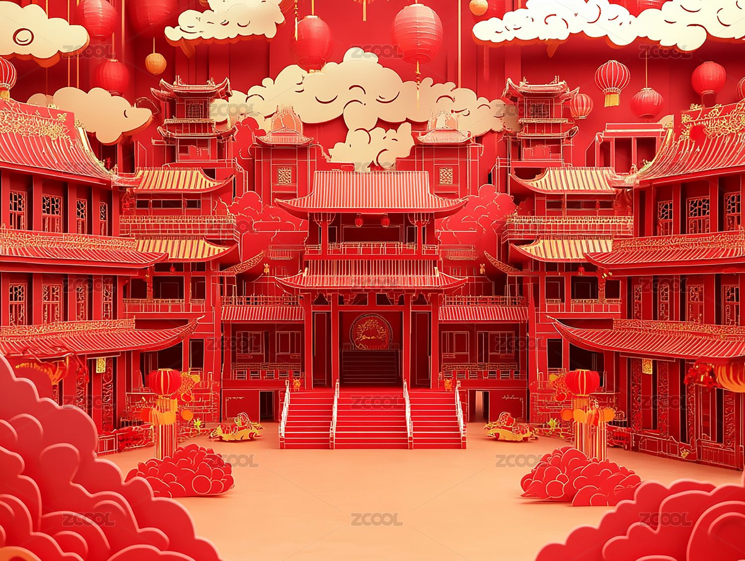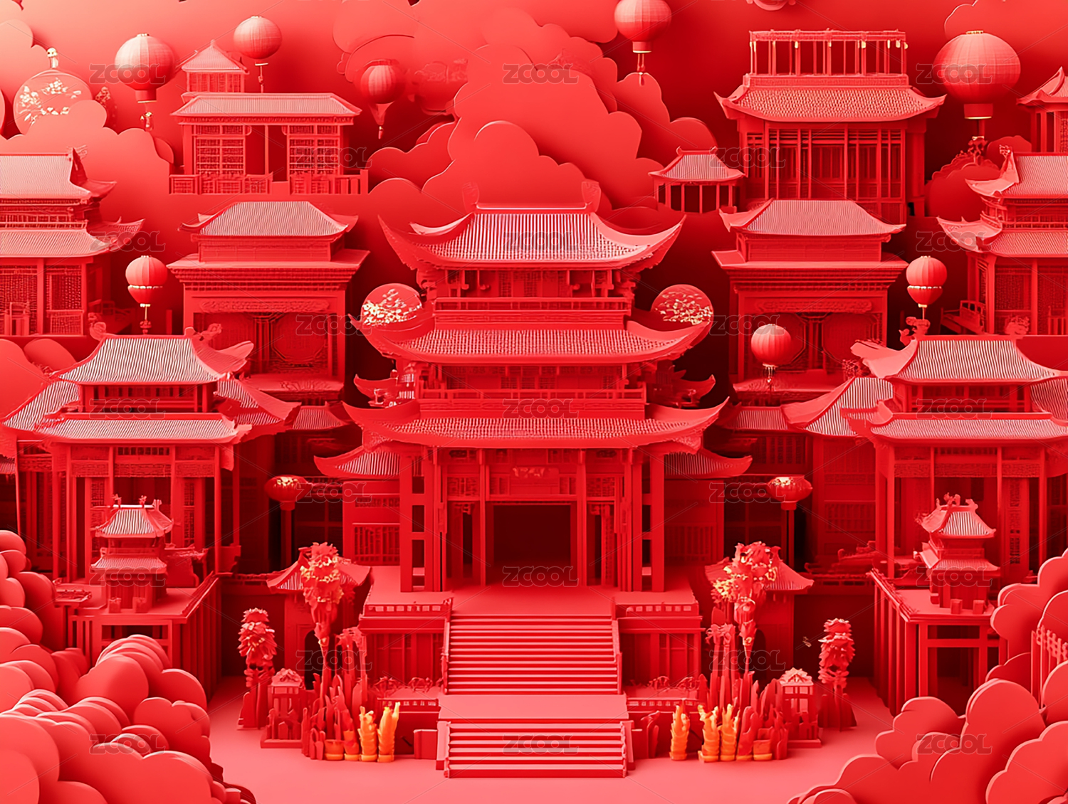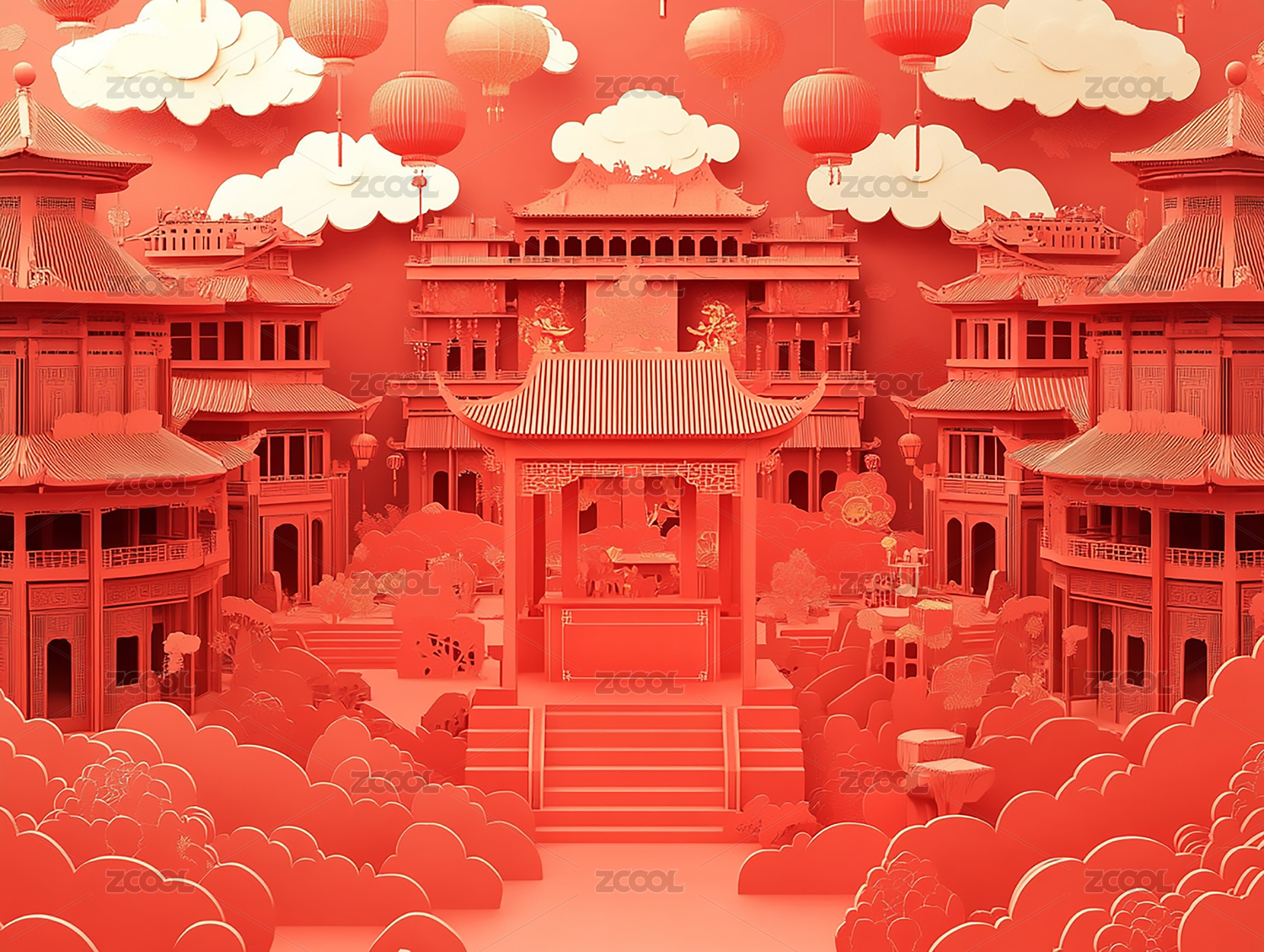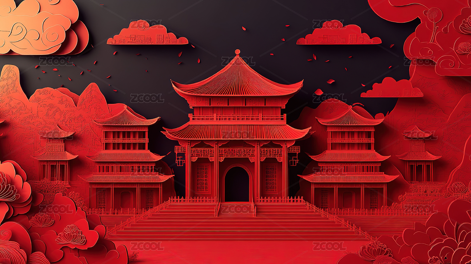 剪纸风中国古建筑红色背景新年春节喜庆庆祝