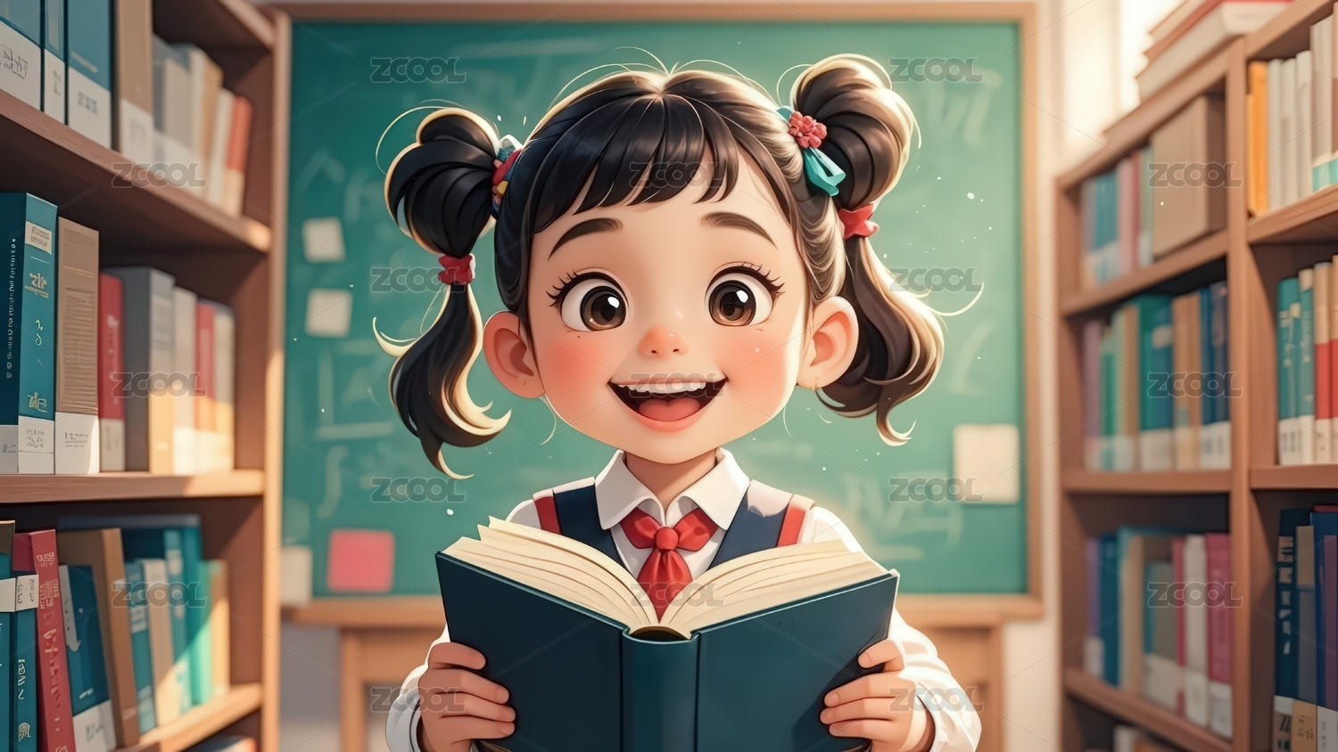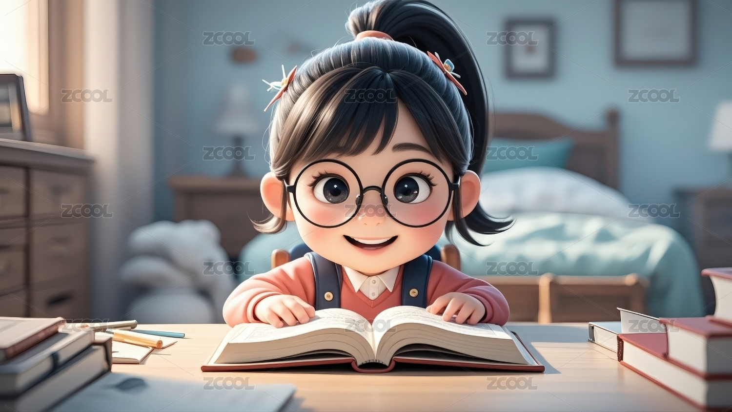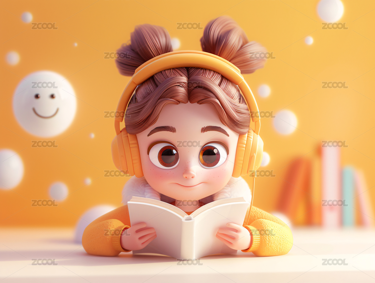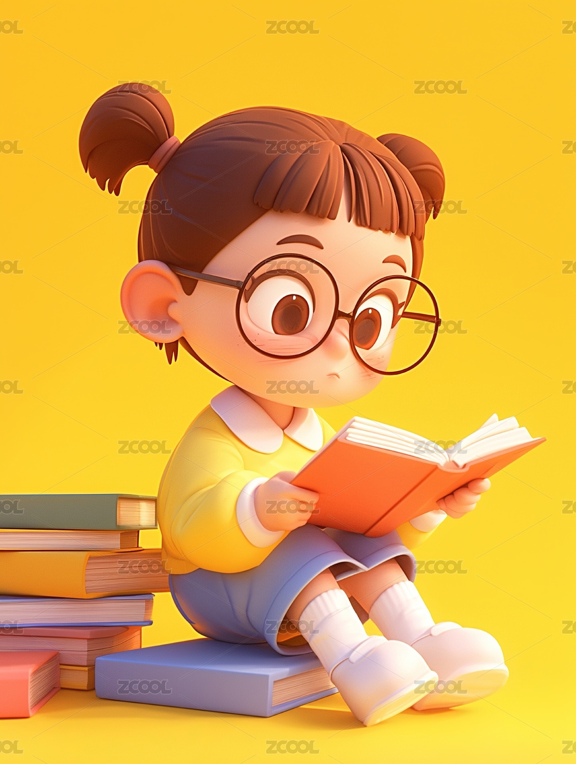 3D卡通风格坐在书堆上阅读读书的女孩肖像