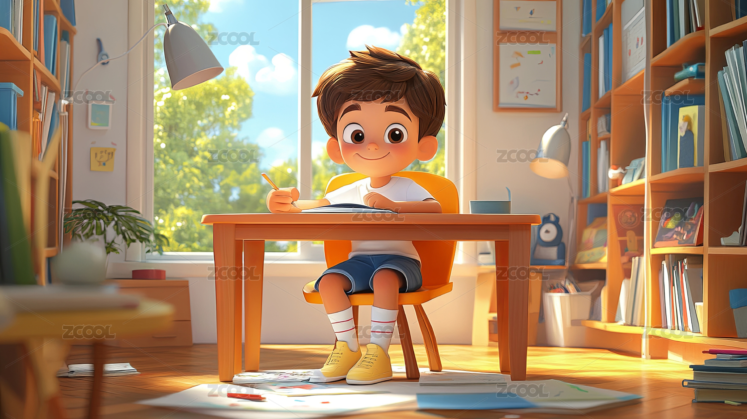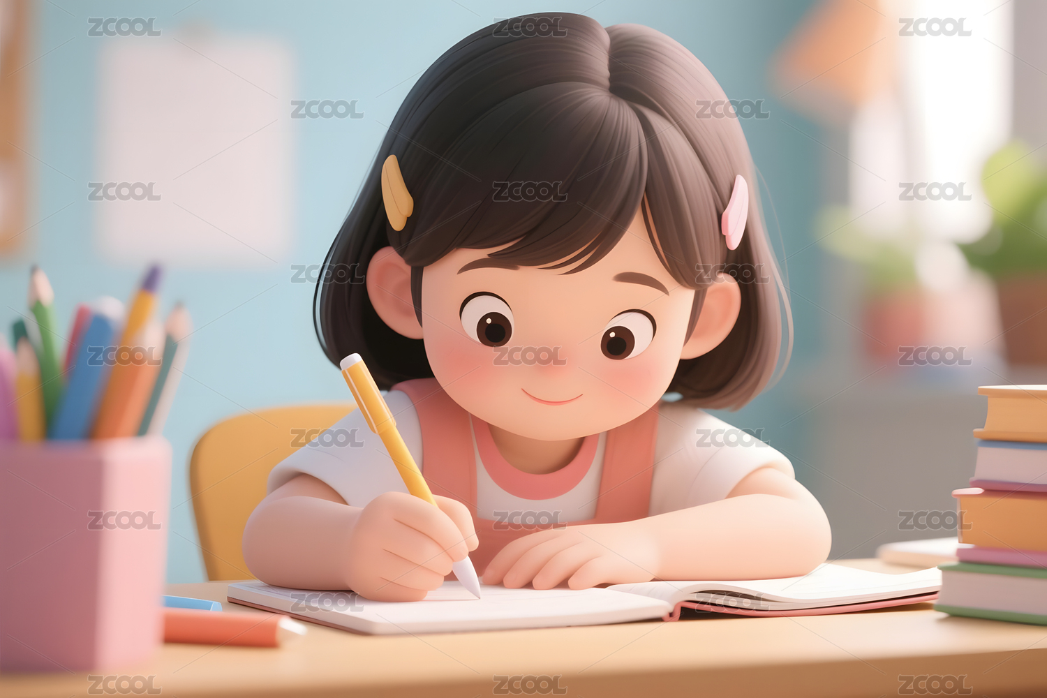 室内窗旁书桌前看书的女性3D卡通立体插画