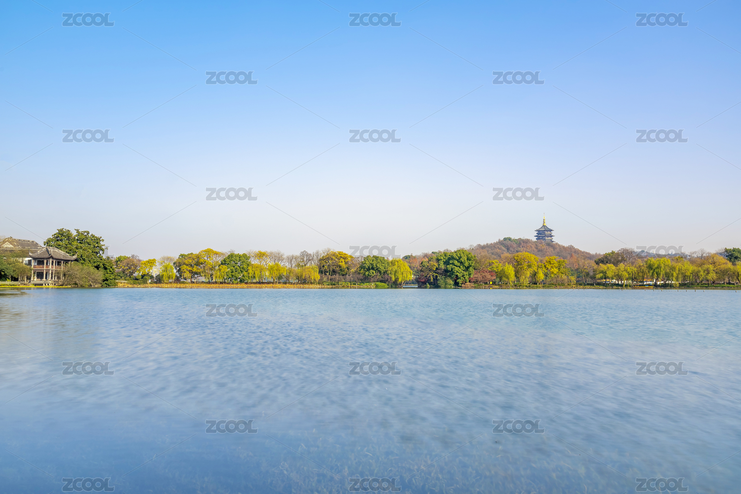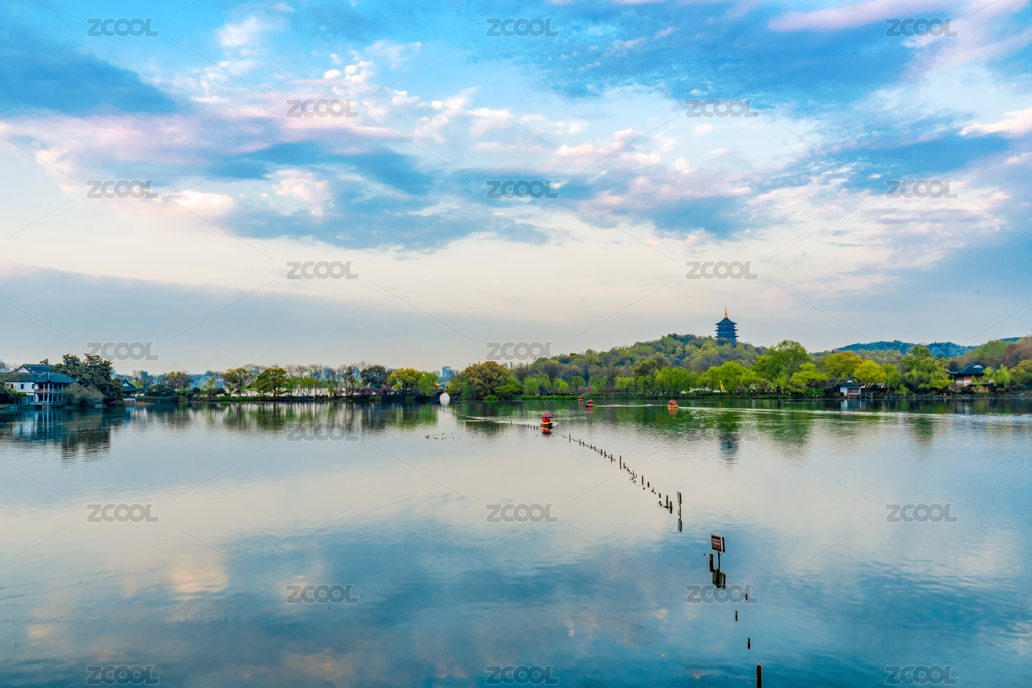 中国浙江杭州西湖春景雷峰塔与苏堤春晓