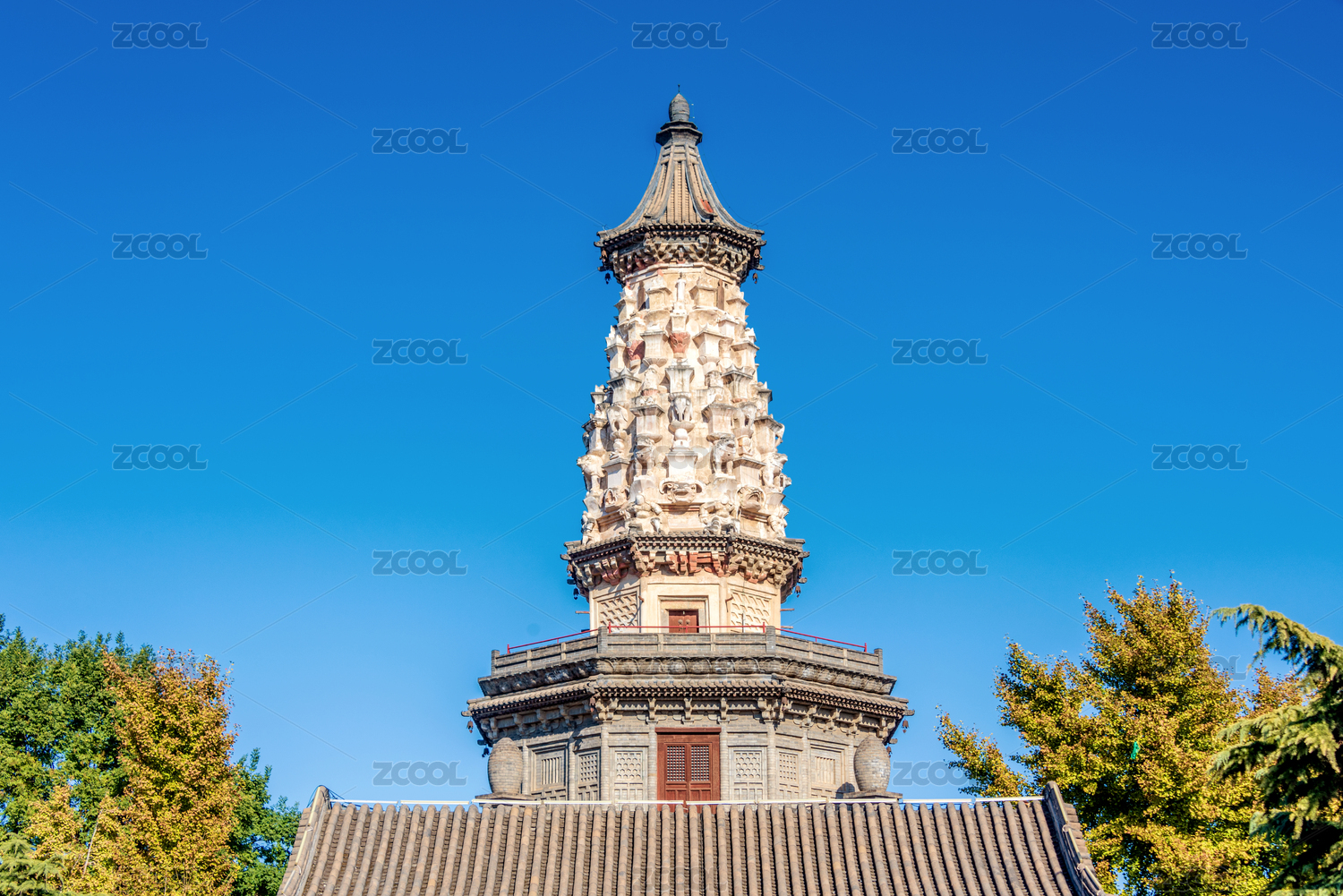 秋天蓝天下的北京颐和园公园的古塔式建筑
