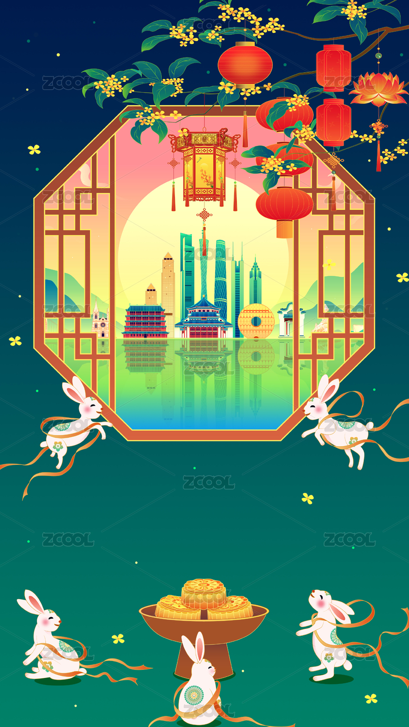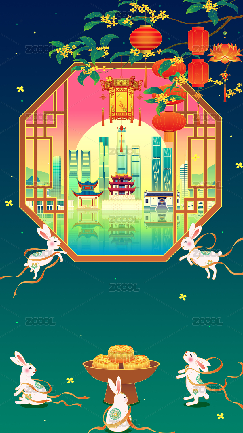 杭州城市中秋节玉兔桂花树国潮插画