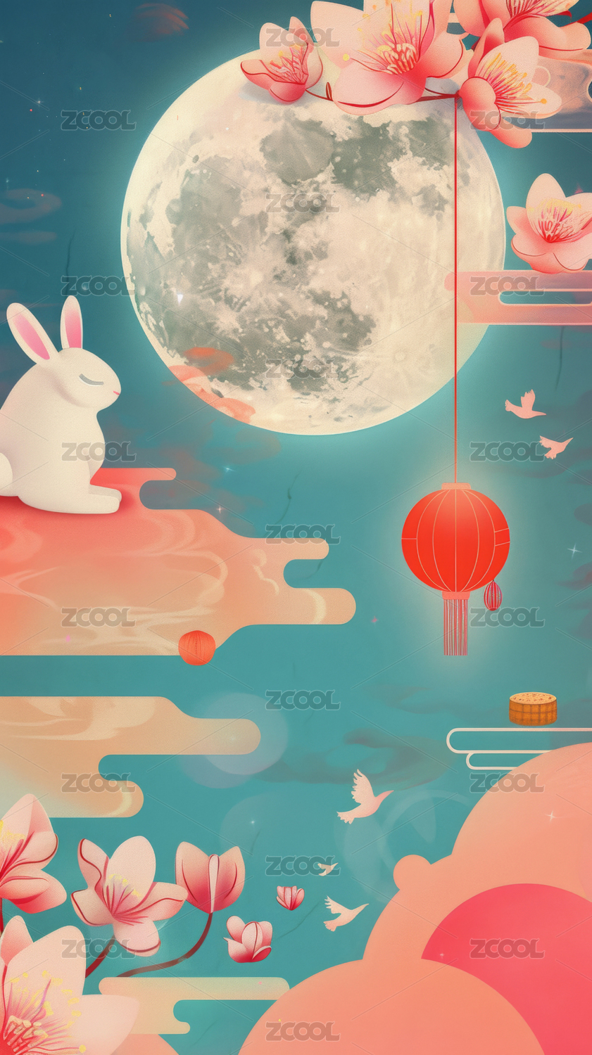 夜空中的月亮和白兔,中秋节海报插画