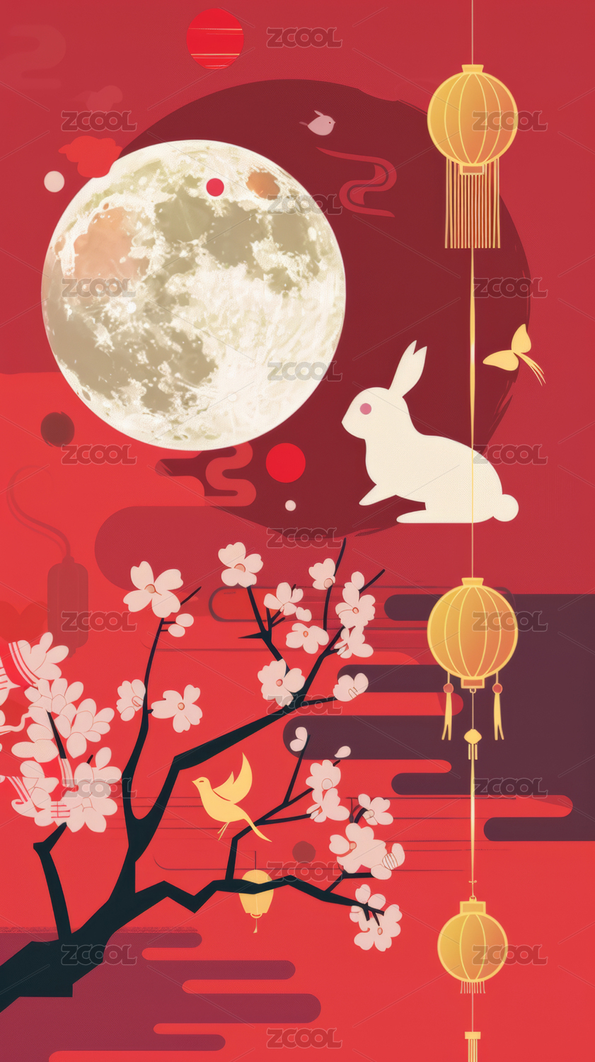 中秋节玉兔月饼灯笼桂花中国风插画