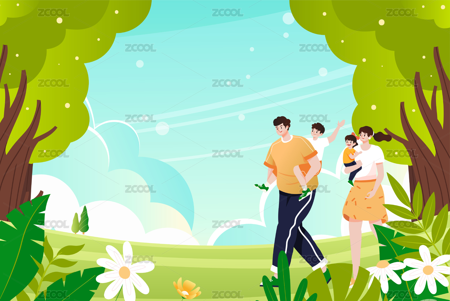 亲子户外旅游风景矢量插画