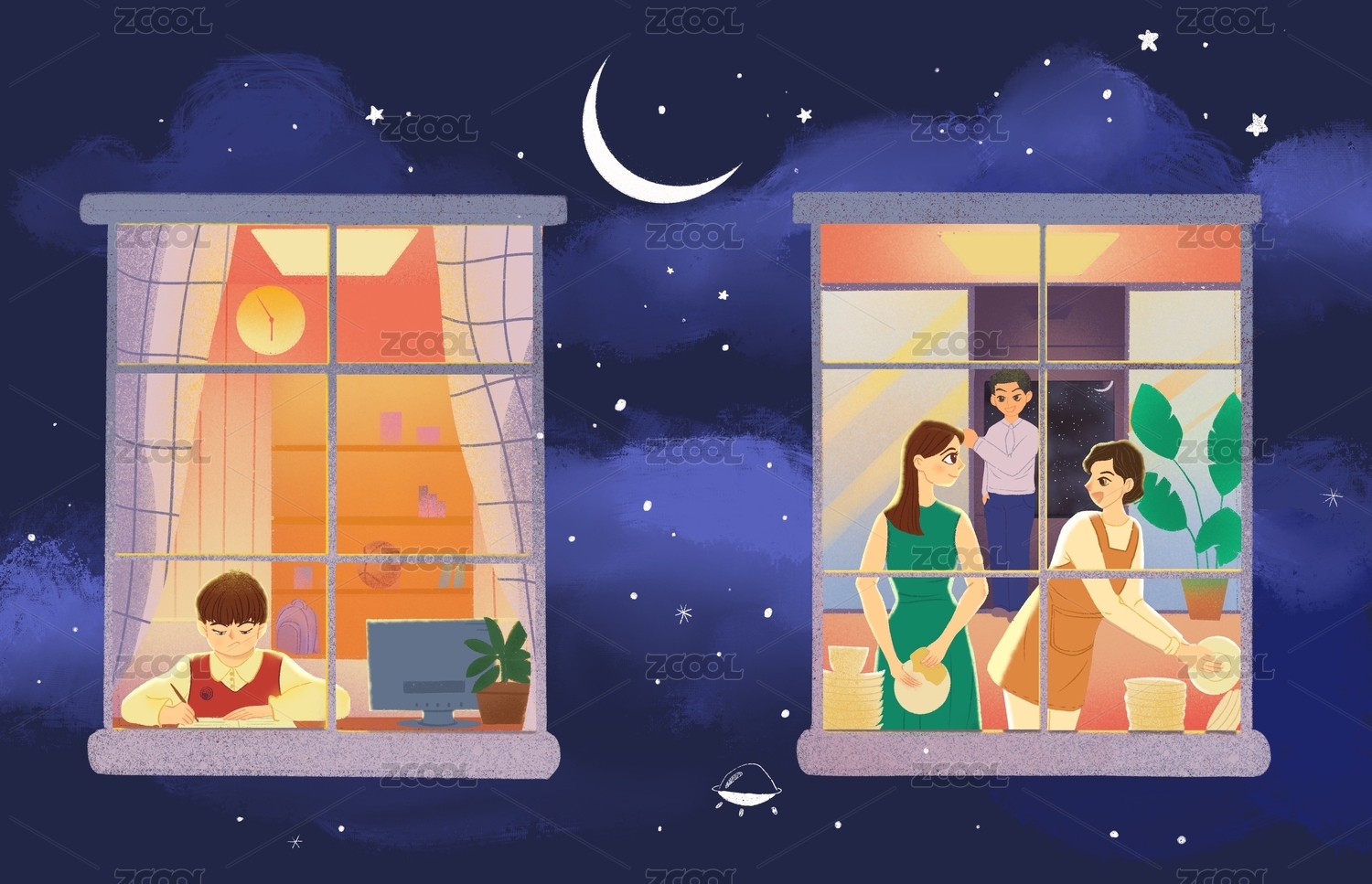中秋节家庭赏月插画