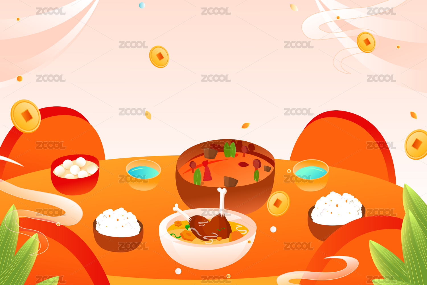 卡通团圆饭吃饭美食中餐外卖活动背景矢量插画