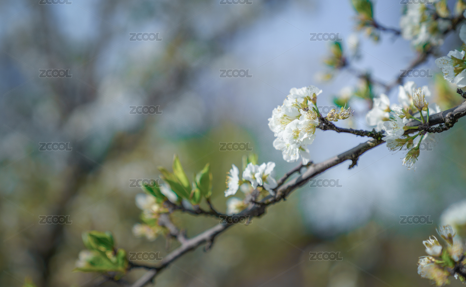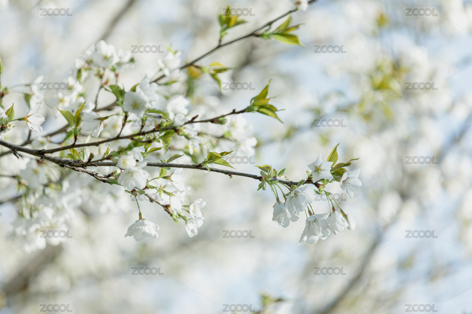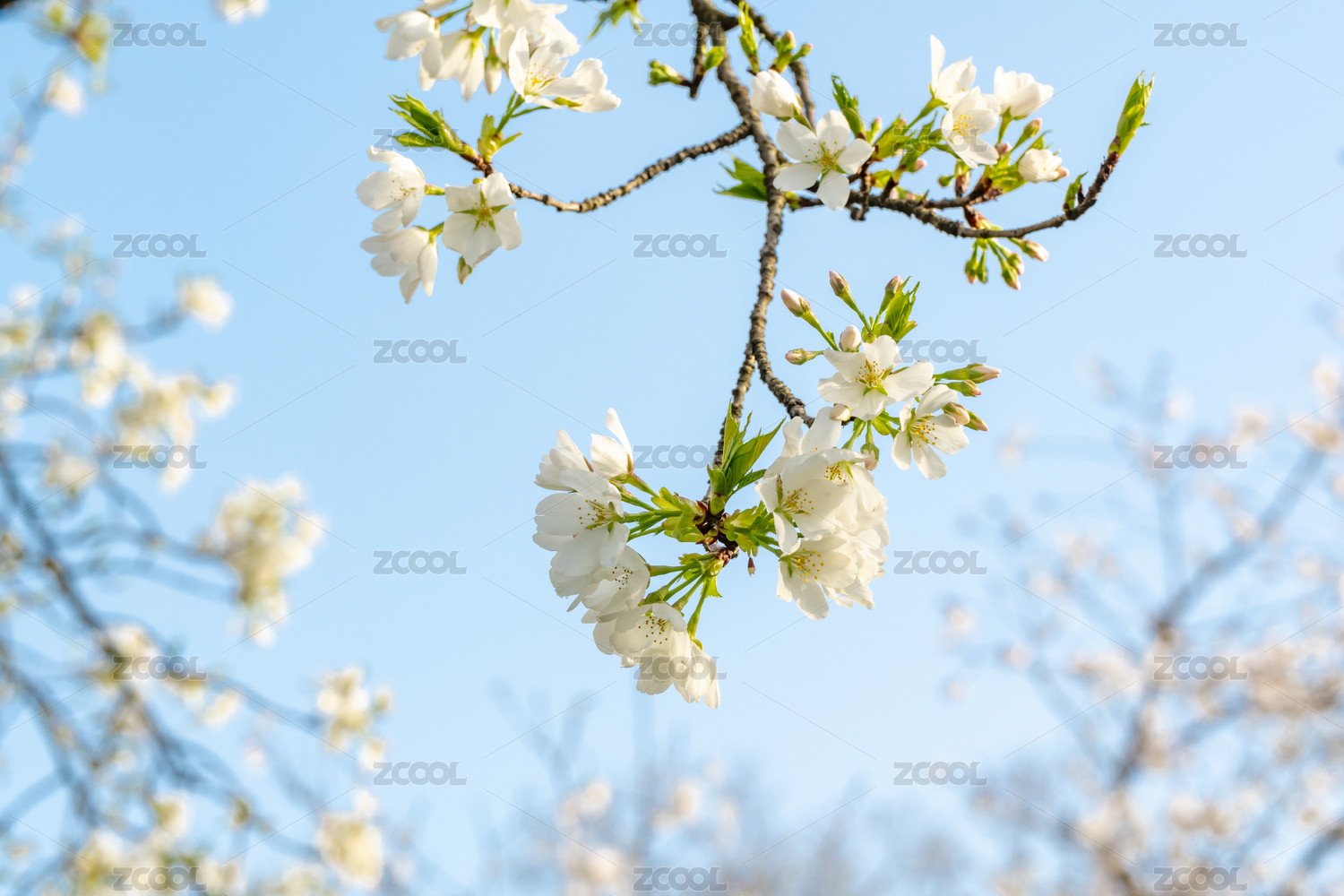 晴朗蓝天下盛开的一枝春天白色樱桃花