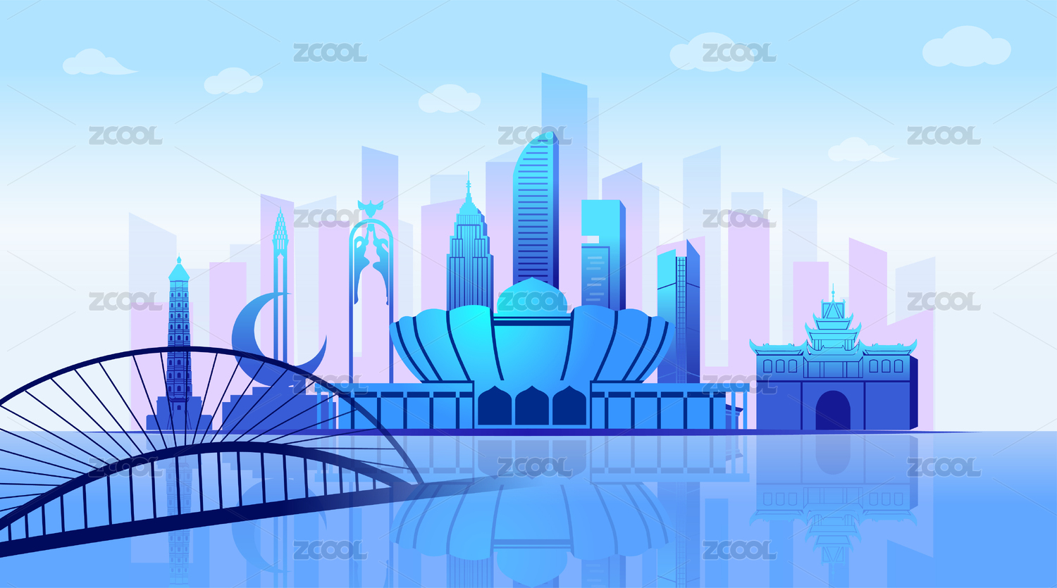 中国广东省佛山市城市天际线矢量插画湖蓝色