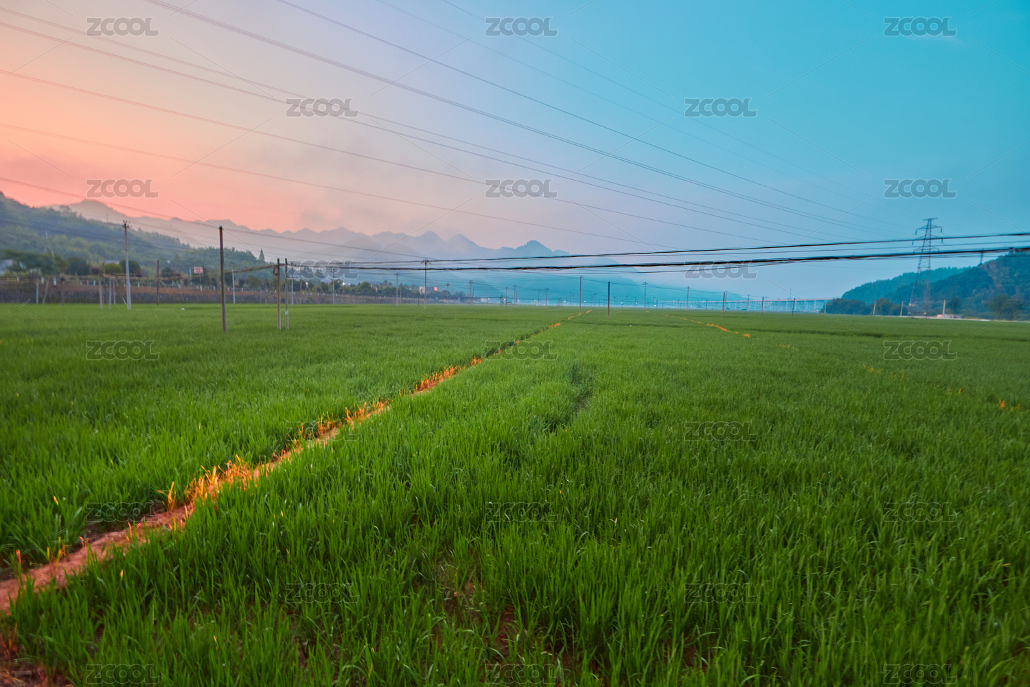 田园风光,草地,高山,地形,天空,草,稻田,水稻,晚霞,霞光