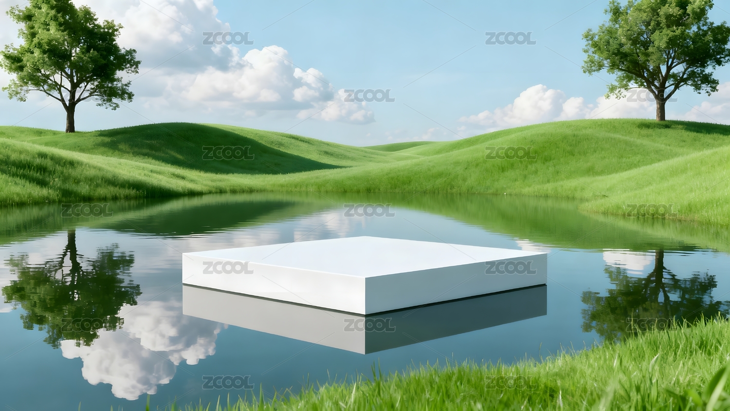 绿色草地与水面的宁静景象