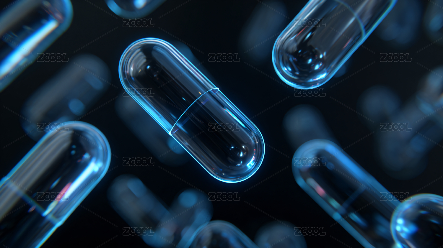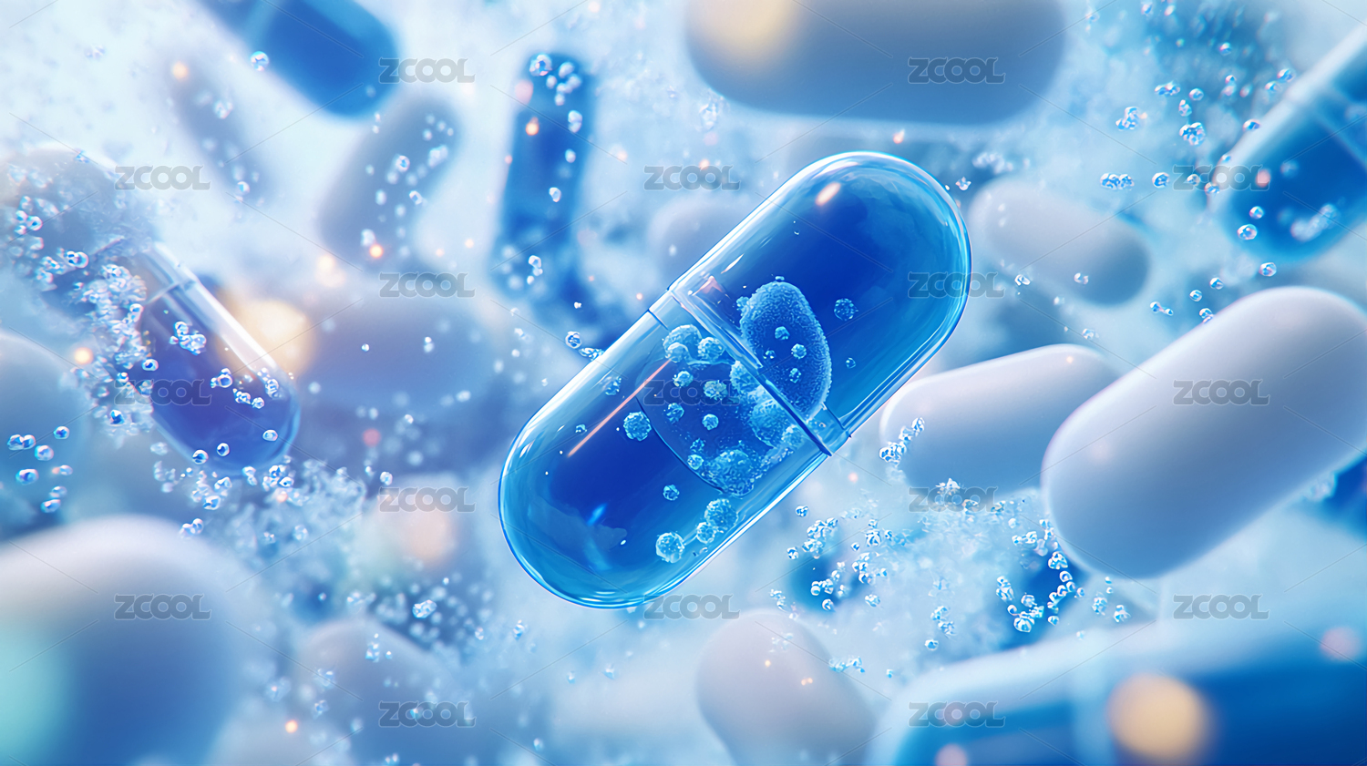 蓝色胶囊落下,闪闪发光的背景,医疗保健
