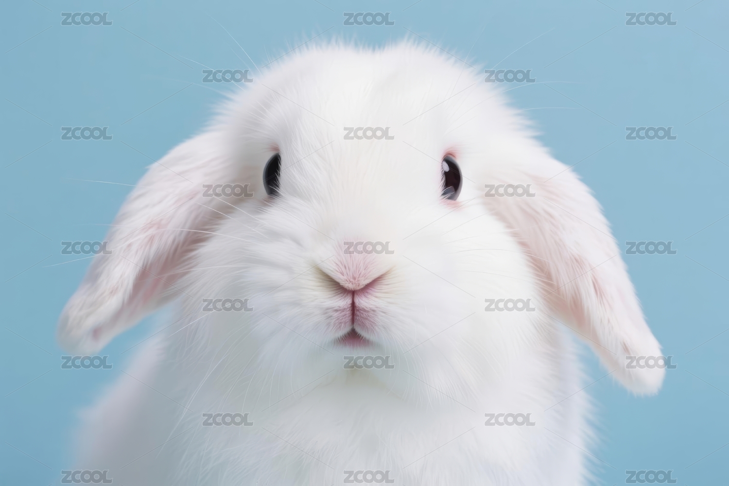 可爱毛茸茸的白色小兔在浅灰色背景上