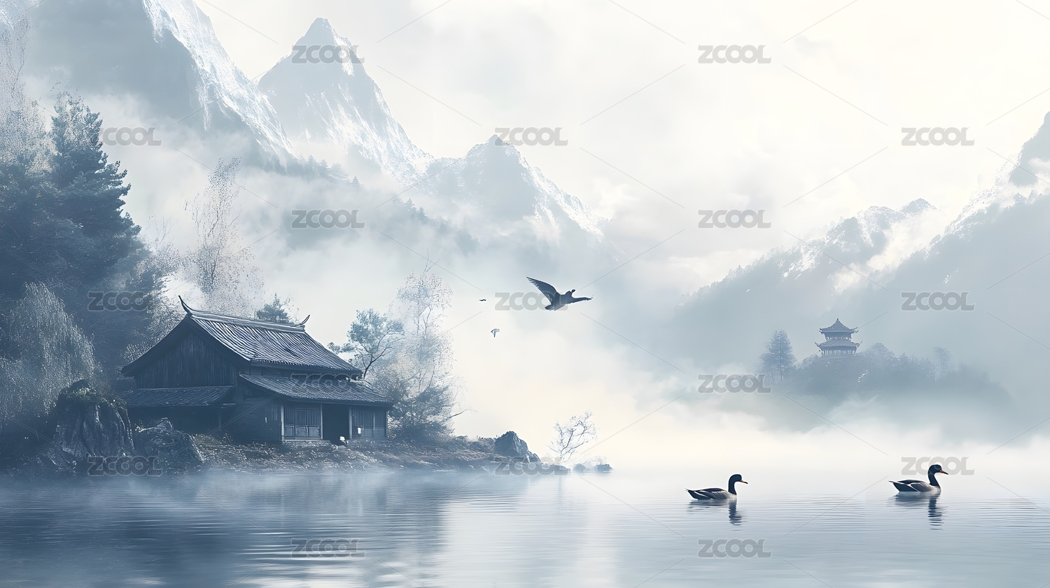 静谧湖泊山峦飞鸟