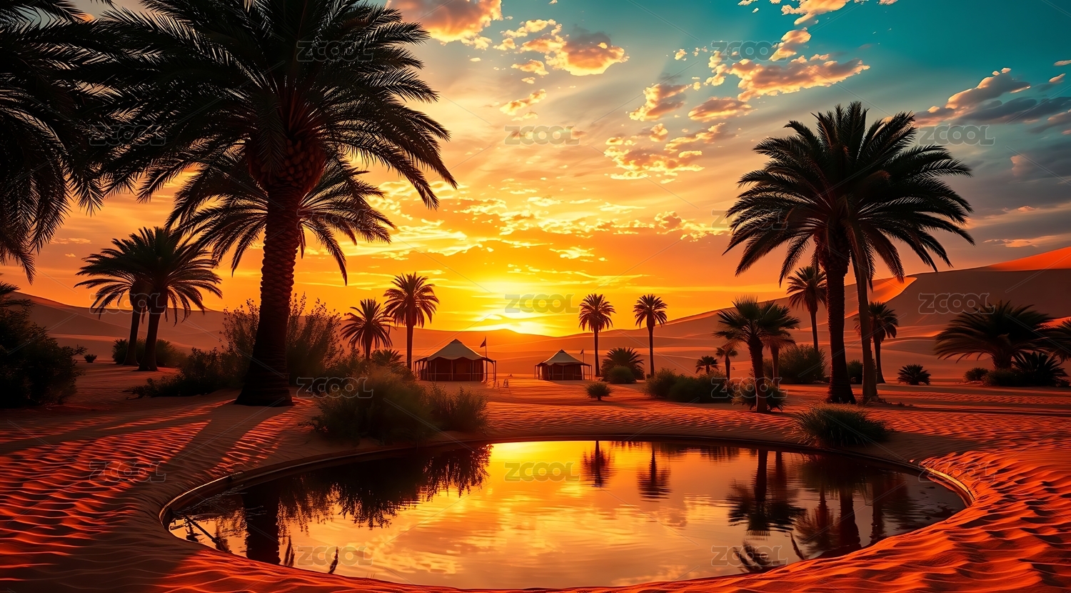 aigc,ai数字艺术,大自然,日落,云,风景,太阳,树林,海滩,棕榈