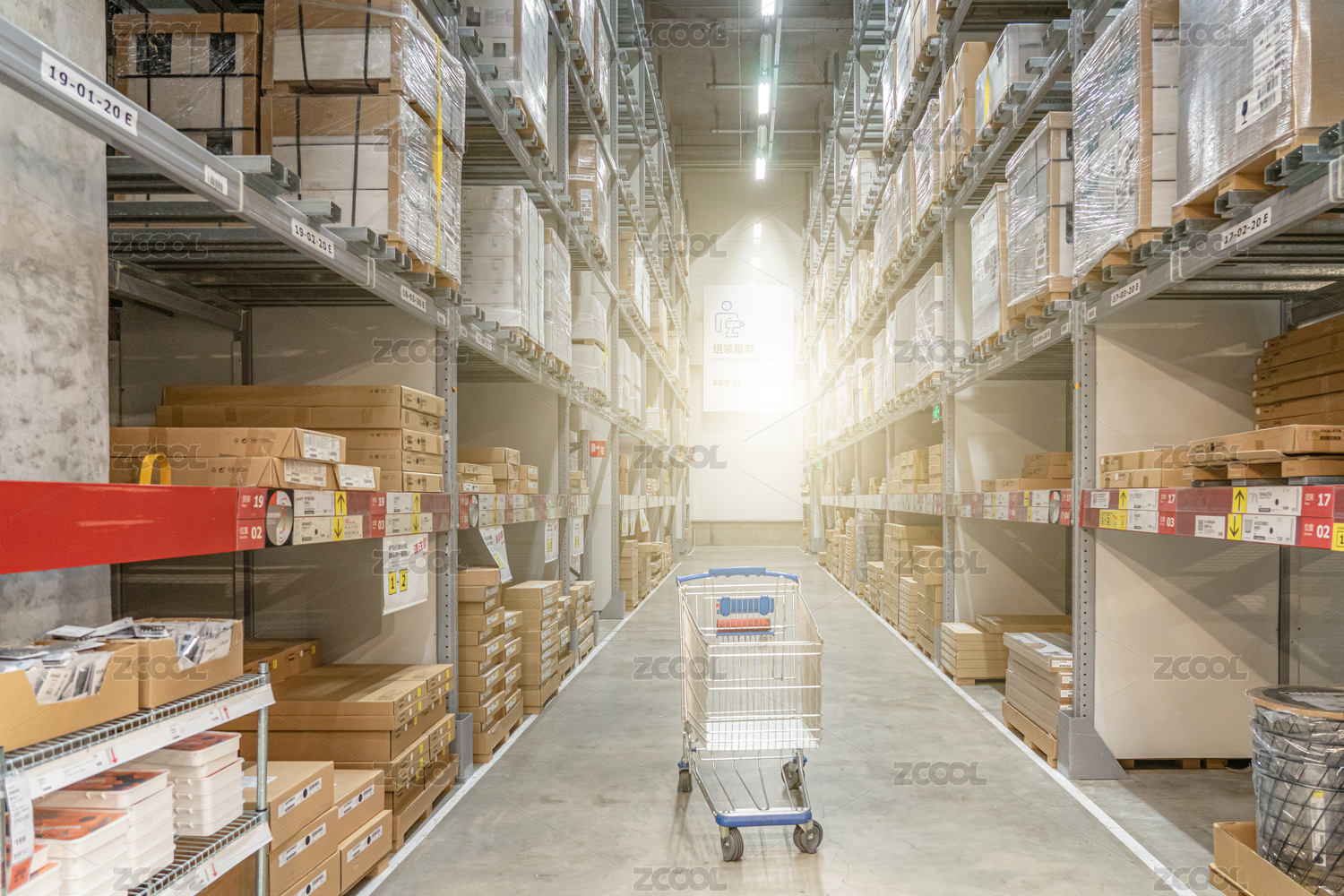 大型商场的仓库货架放满货物
