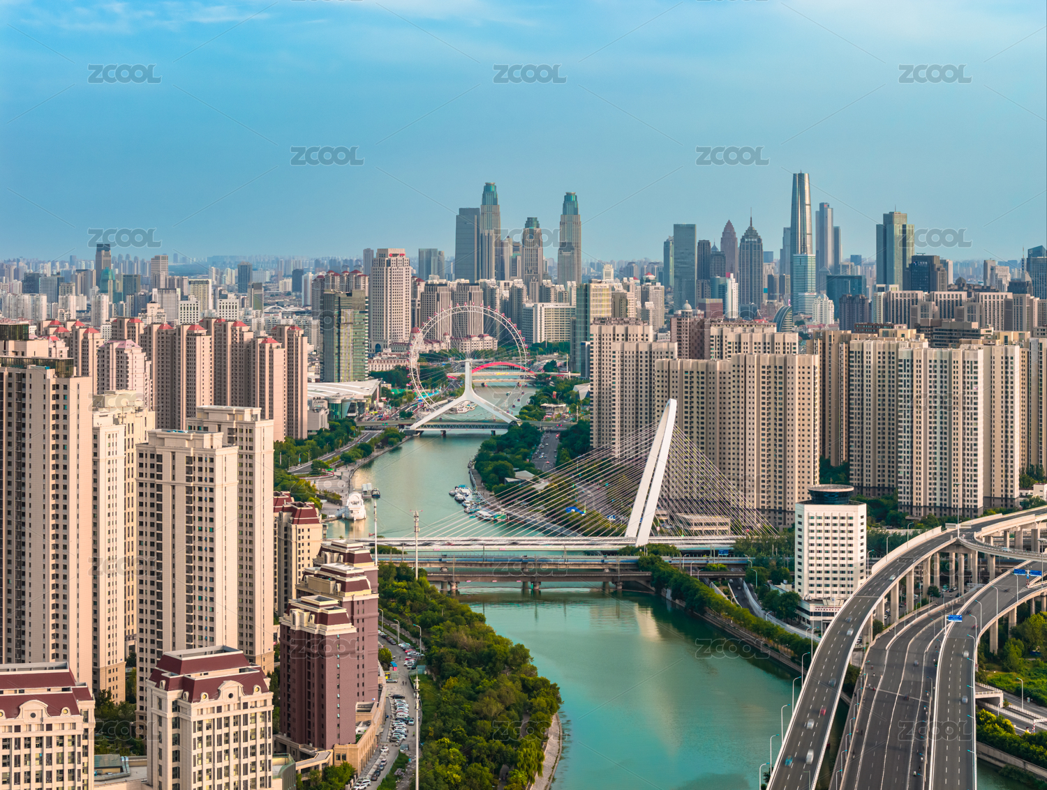天津古文化街码头海河沿岸城市建筑日落夜景