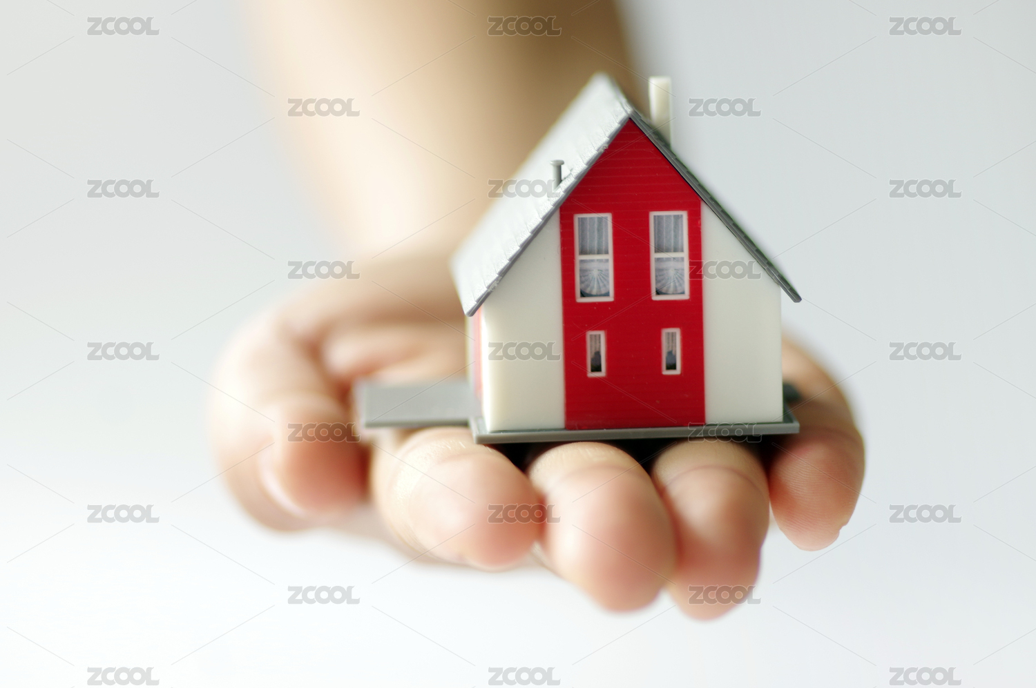 草地背景下捧在手心里的小房子模型——买房概念图片