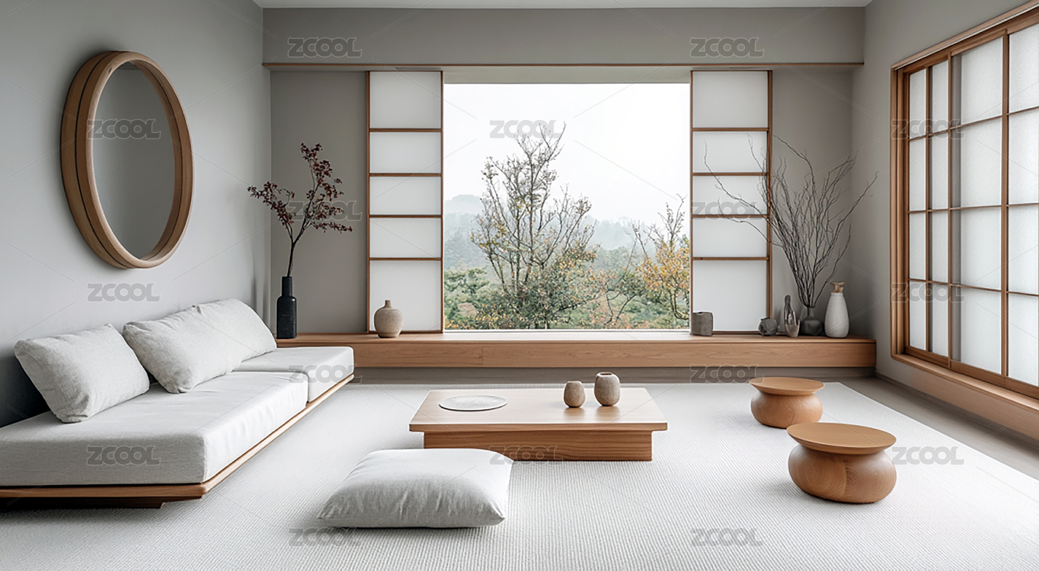 榻榻米,庭院,盆栽,禅意,茶几,采光,植物,静谧,舒适,宁静