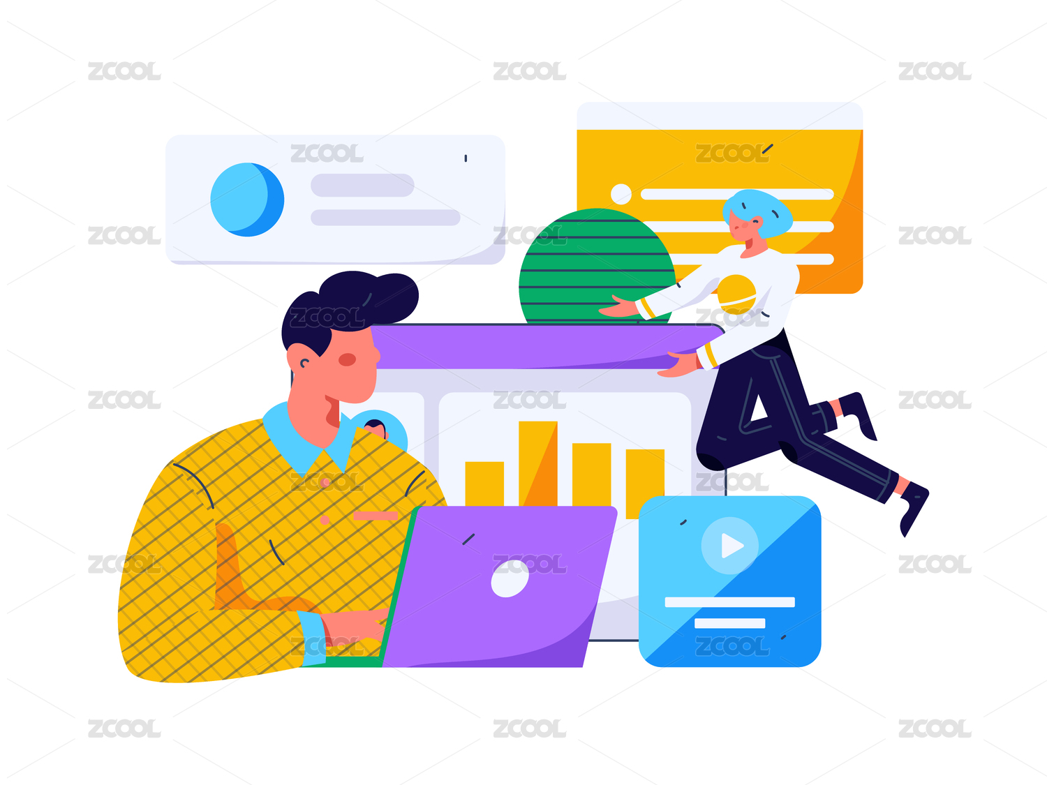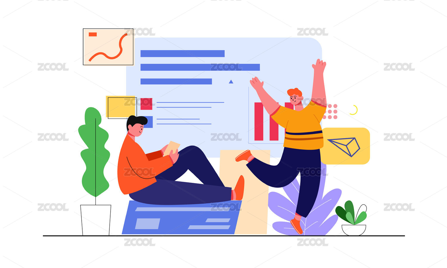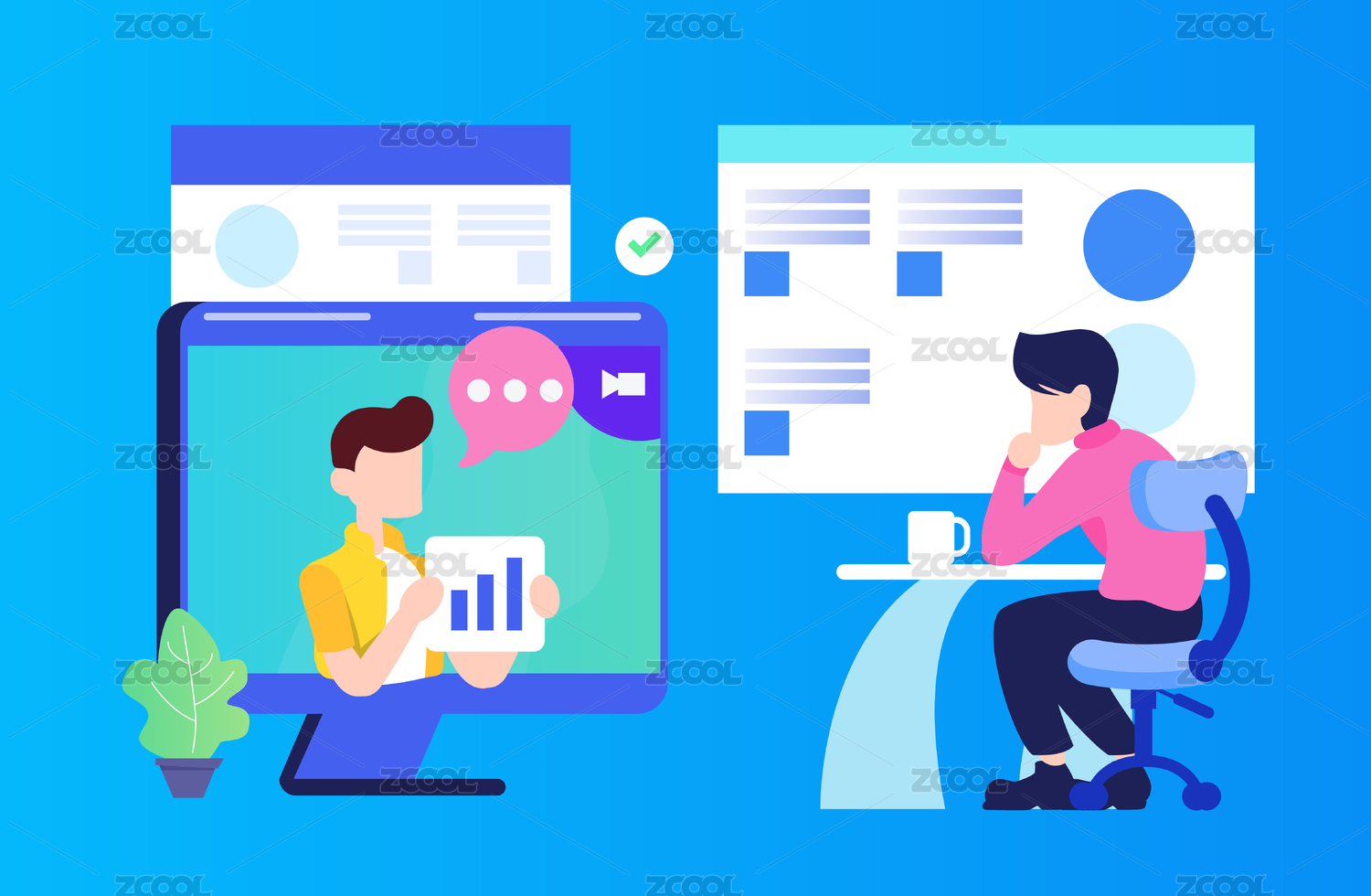 工作中的白领远程协作提高效率,矢量扁平概念清新插画