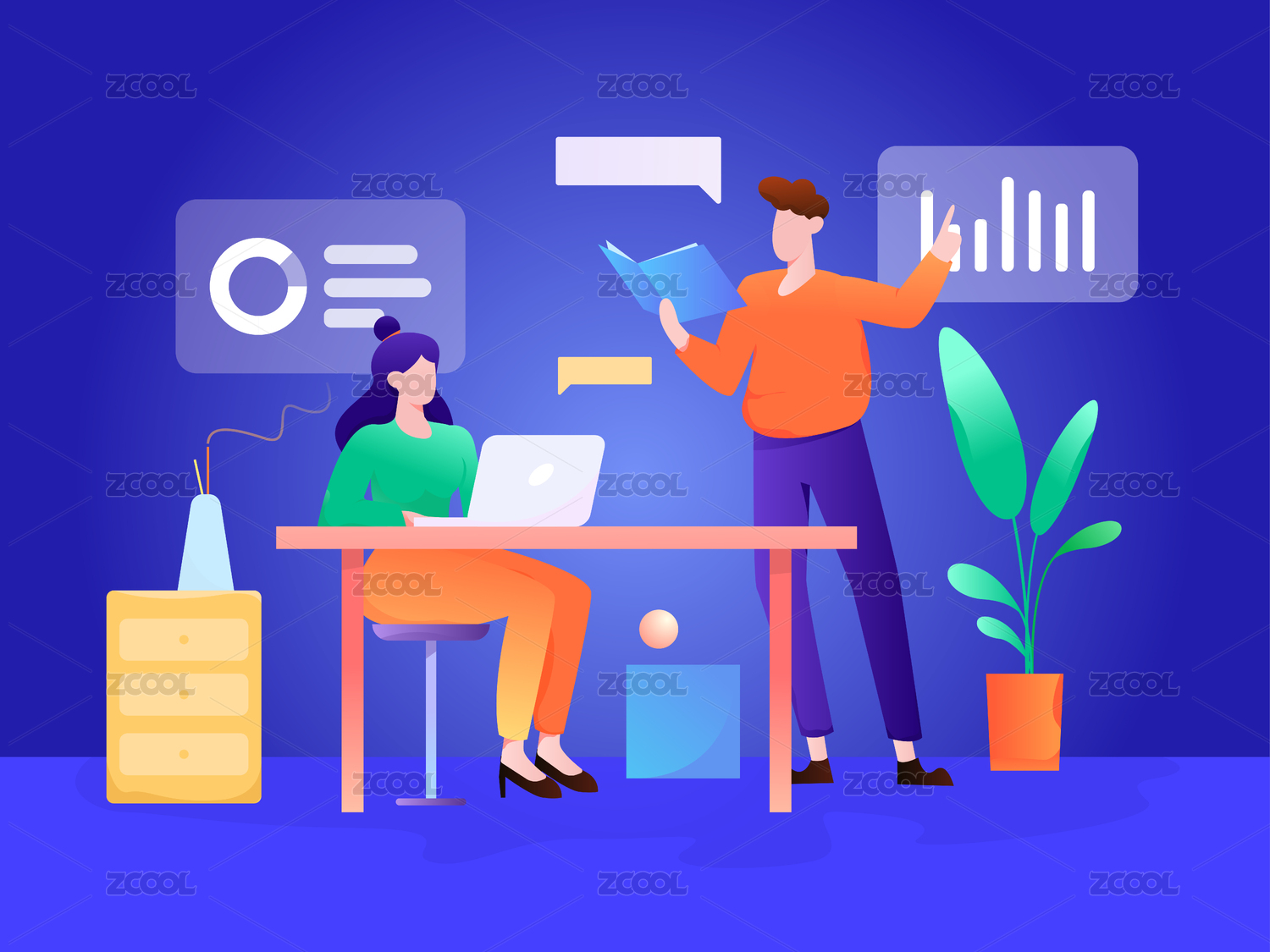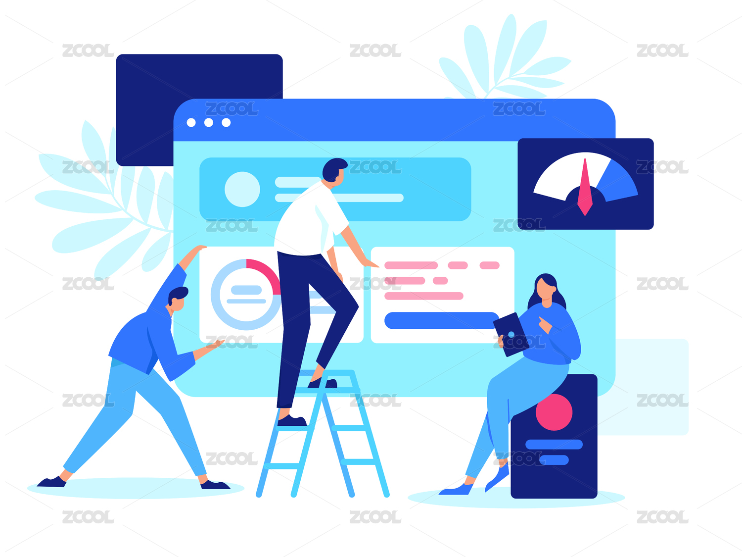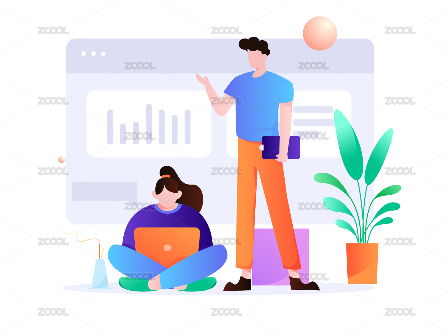 工作中的白领远程协作提高效率,矢量扁平概念清新插画