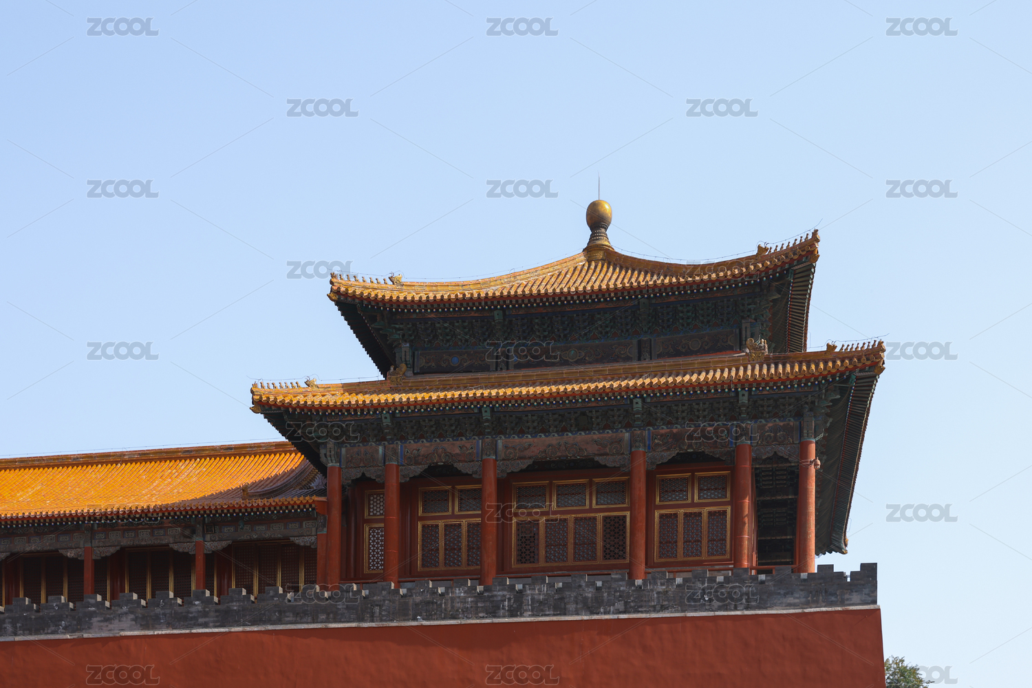 中国北京故宫博物院午门旁古建一角——红墙琉璃瓦屋顶飞檐瑞兽
