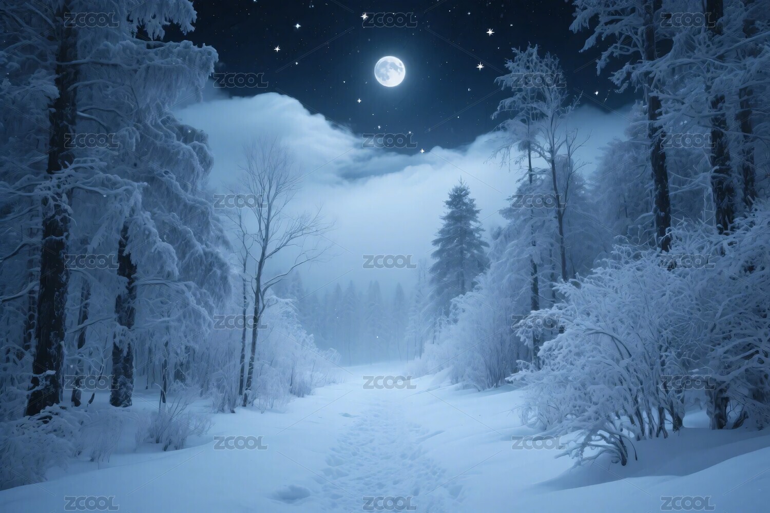 雪夜森林与满月星空