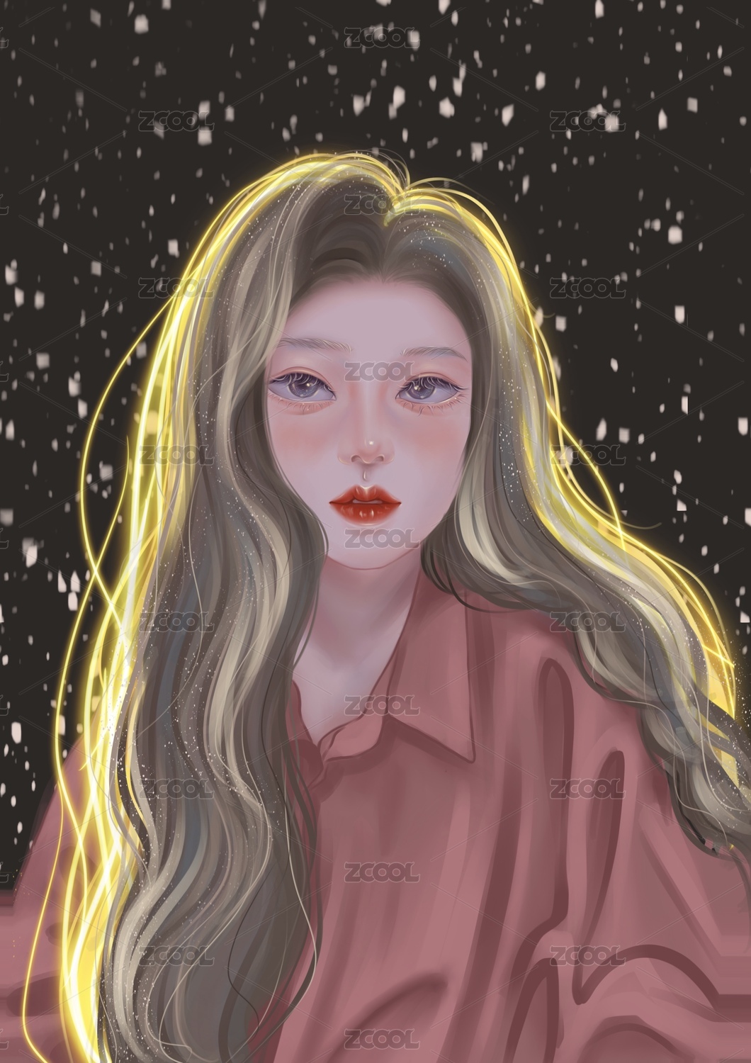 穿着红衬衣的长发女孩在下雪天夜晚的灯光下