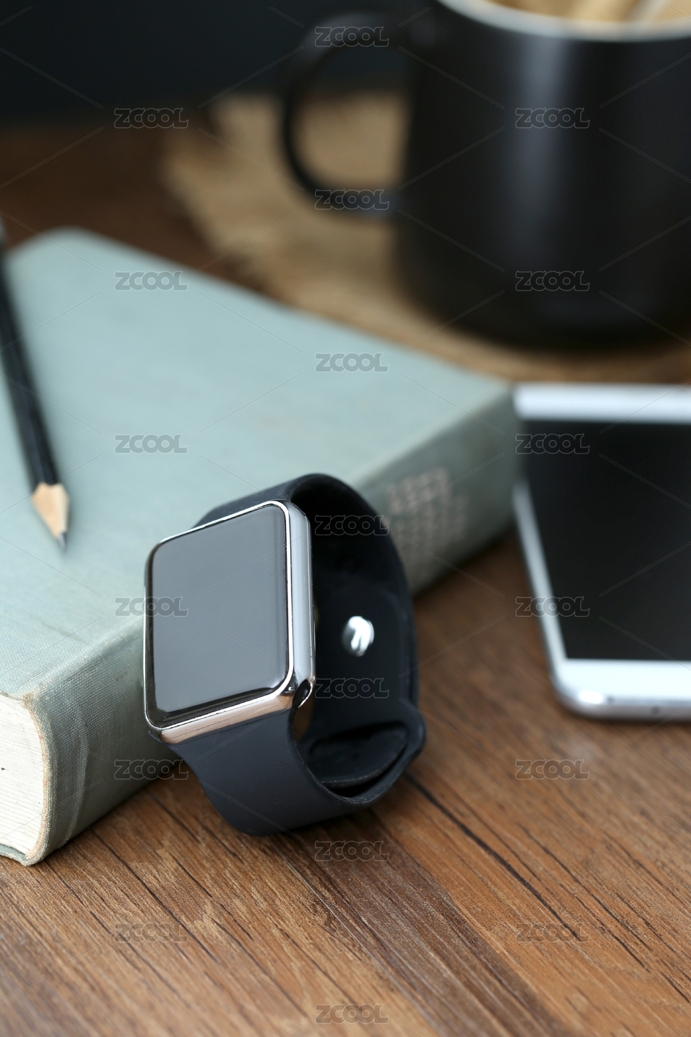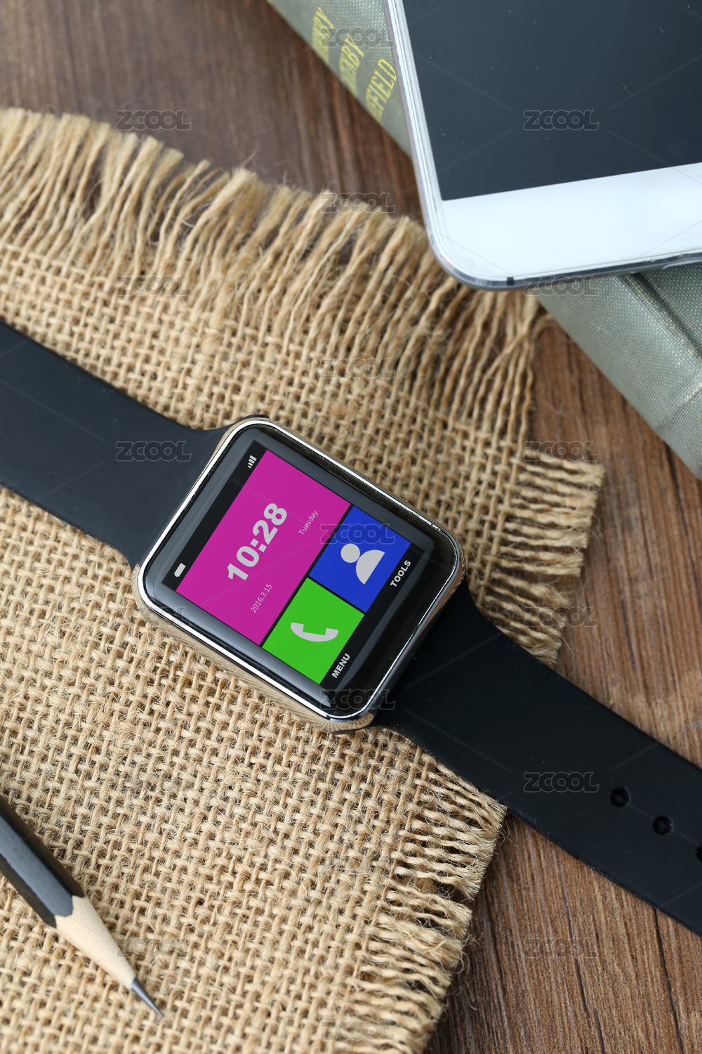 智能手表和智能手机放在桌面上