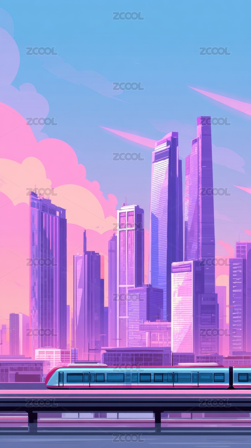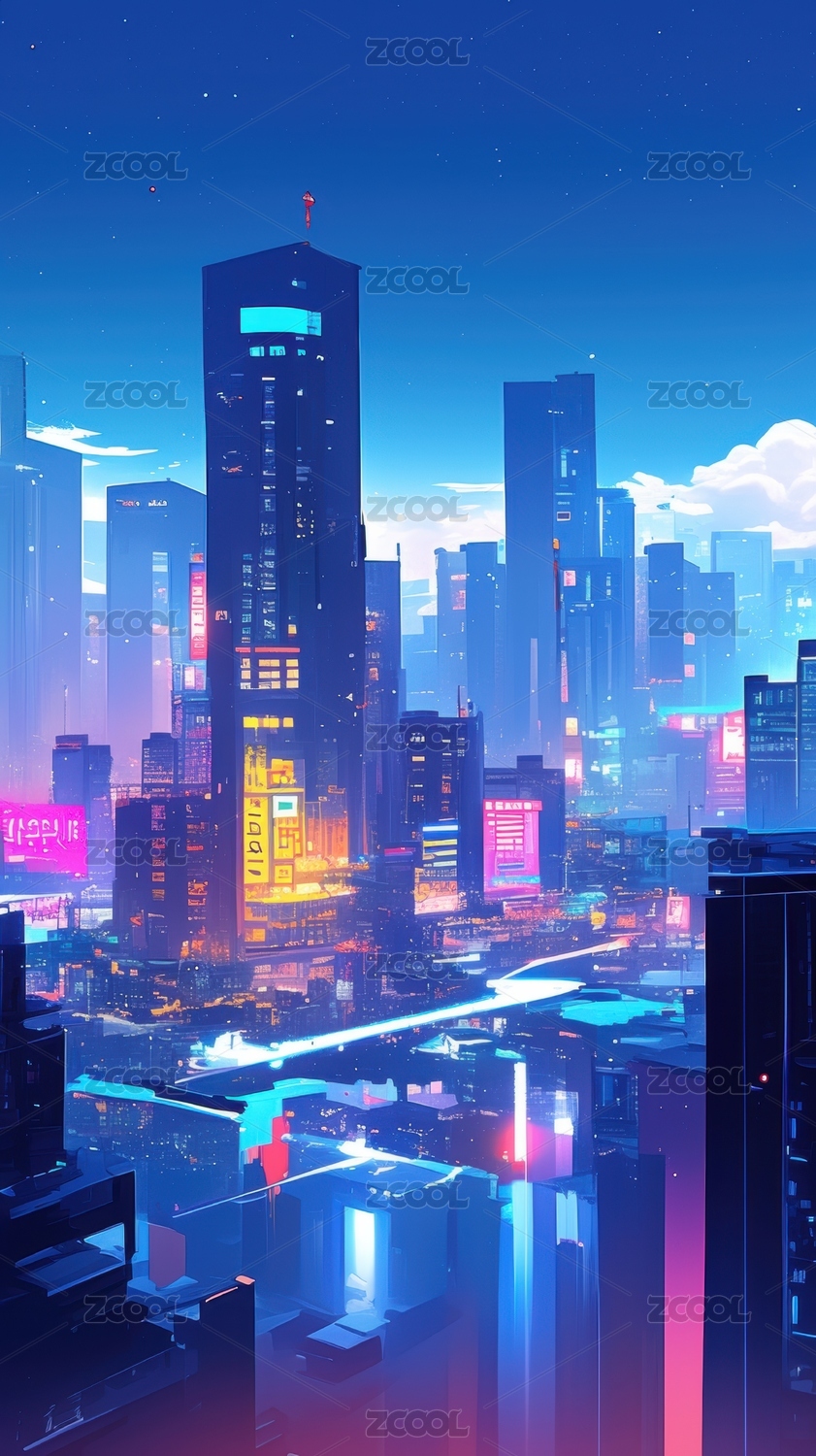夏日,傍晚,城市,高楼,夜景,灯光,闪烁,插画