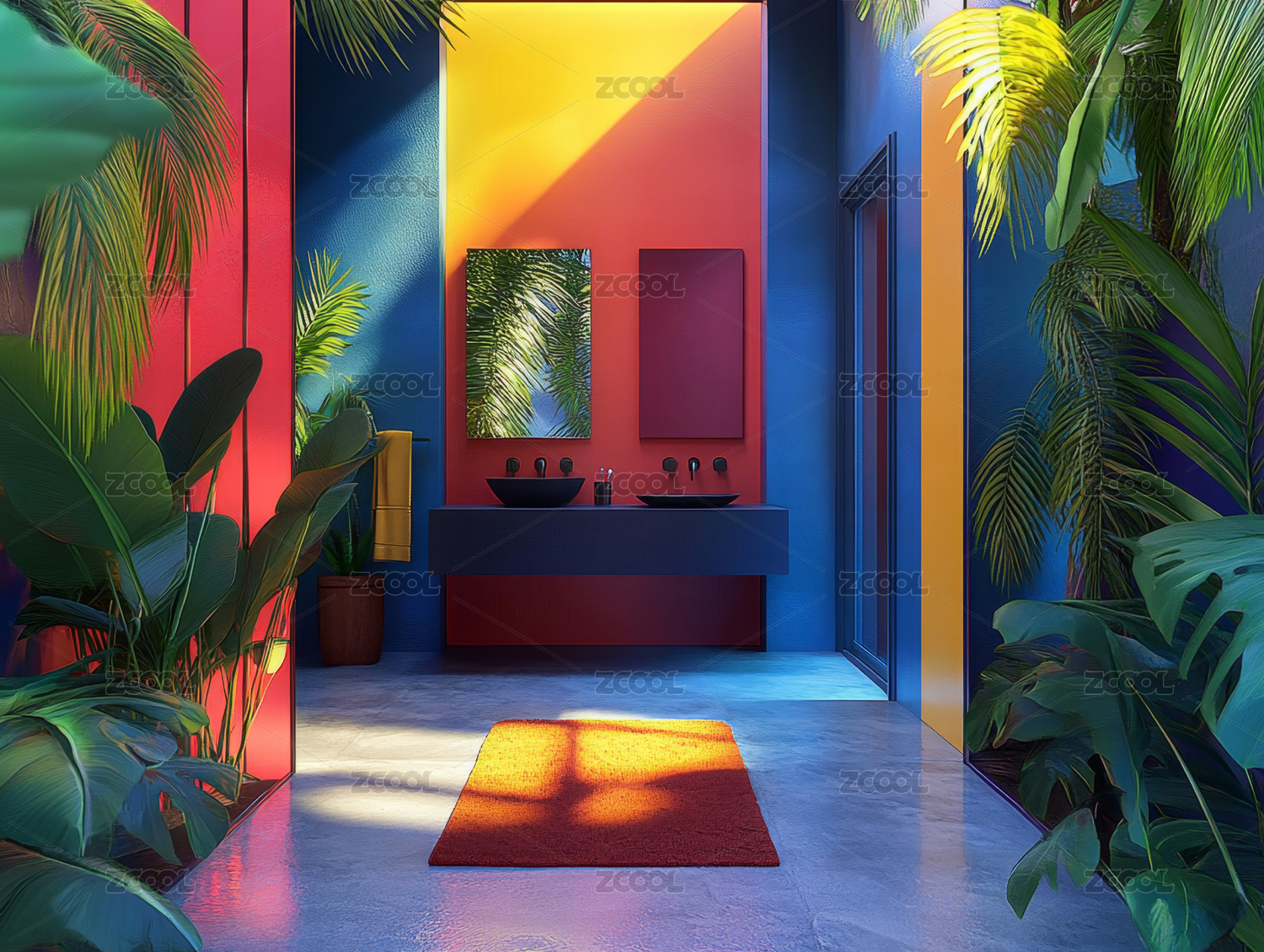 浴室,热带,植物,黄色,蓝色,圆形,镜子,洗手台,地毯,自然光