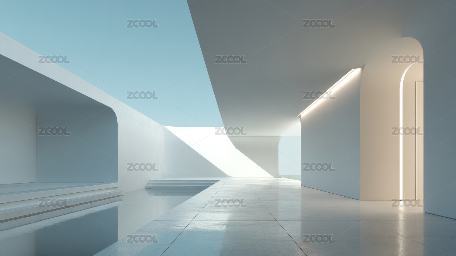 白色,光滑,质感,地面,墙壁,蓝色,立柱,半透明,玻璃板,反射