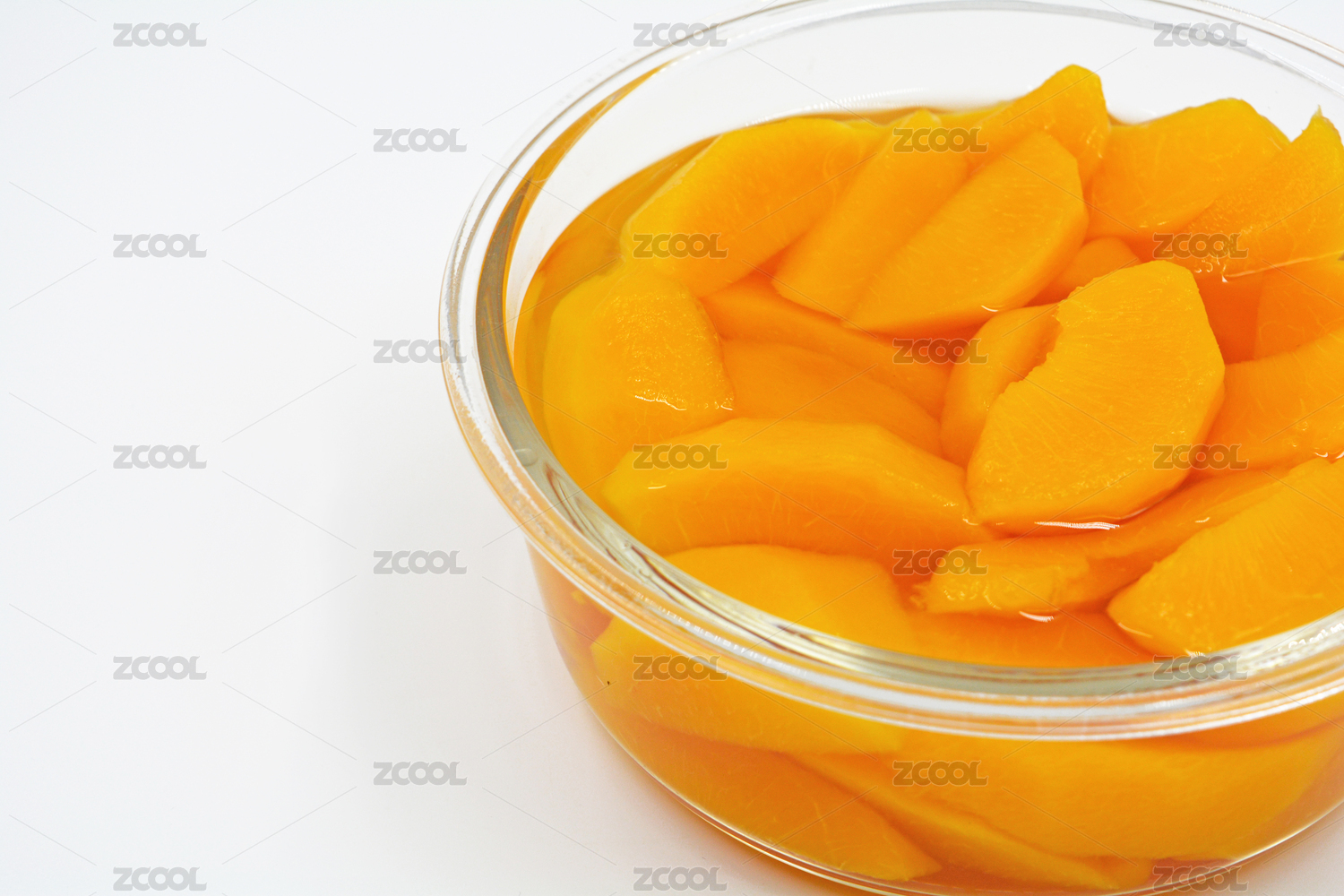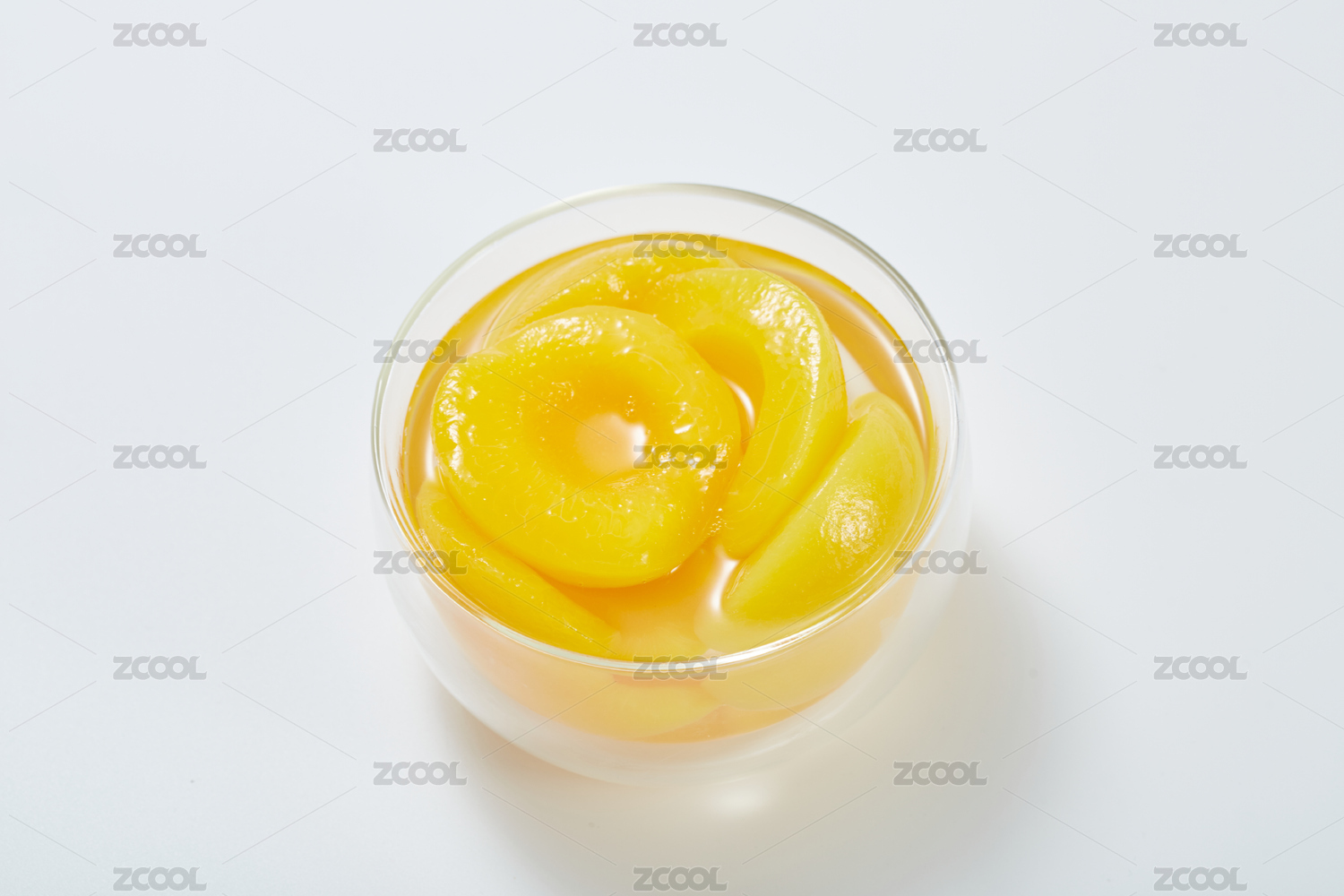 装在玻璃碗里自制的黄桃罐头,白色背景,俯拍