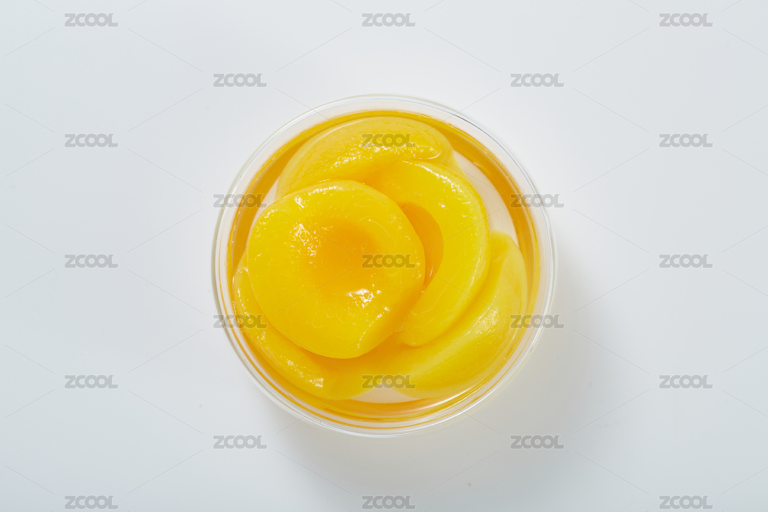 装在玻璃碗里自制的黄桃罐头,白色背景,俯拍