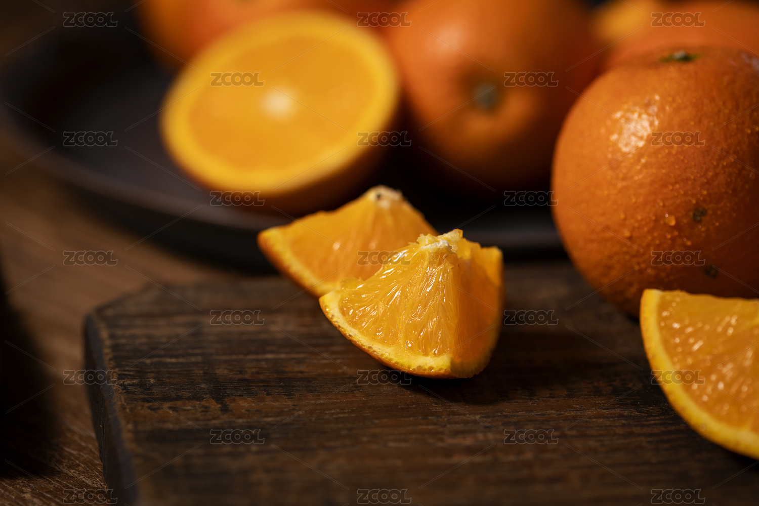 切开的新鲜橙子逆光暗调背景