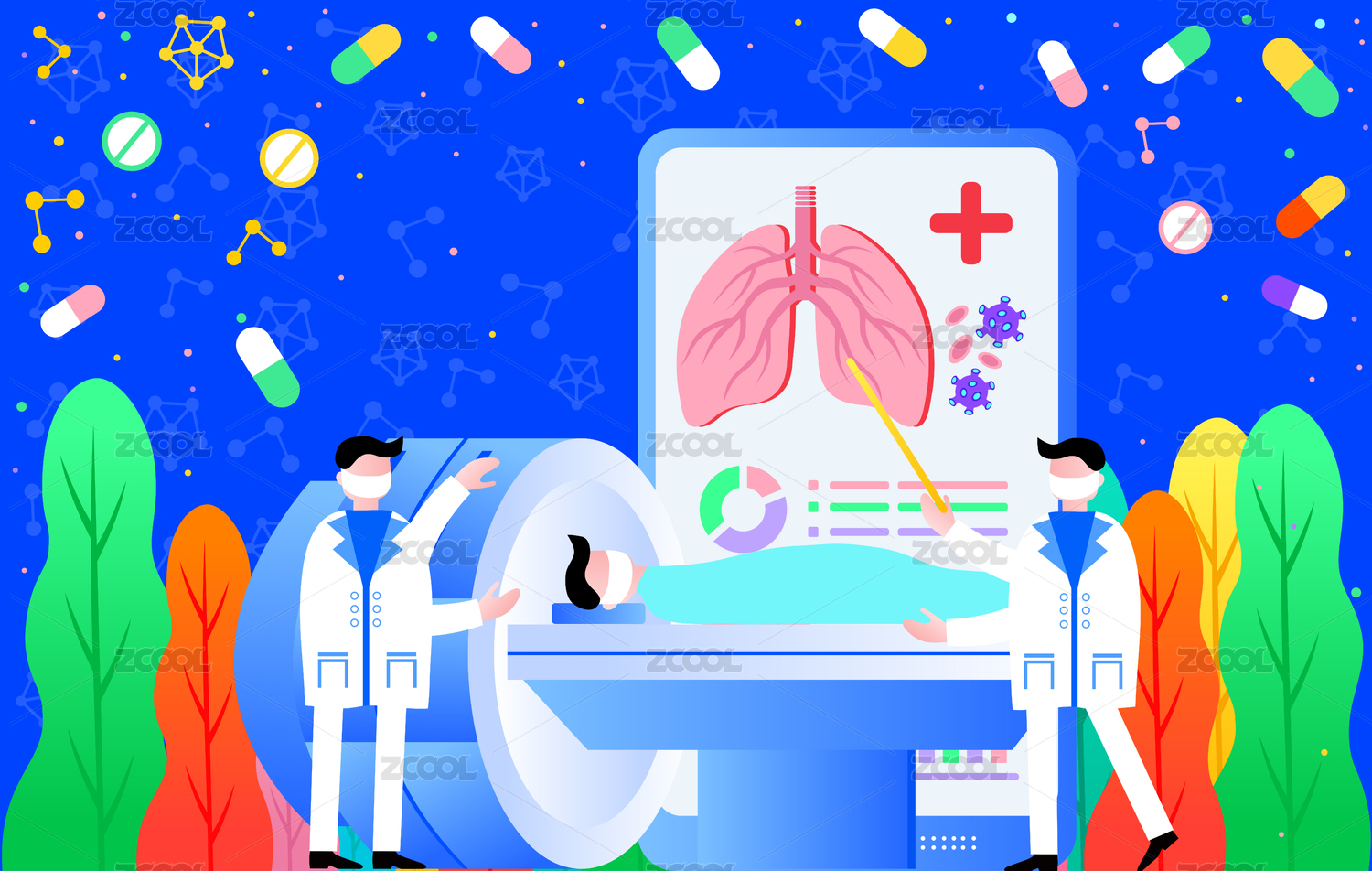 医生分析肺炎CT检查报告炫彩科技风插画