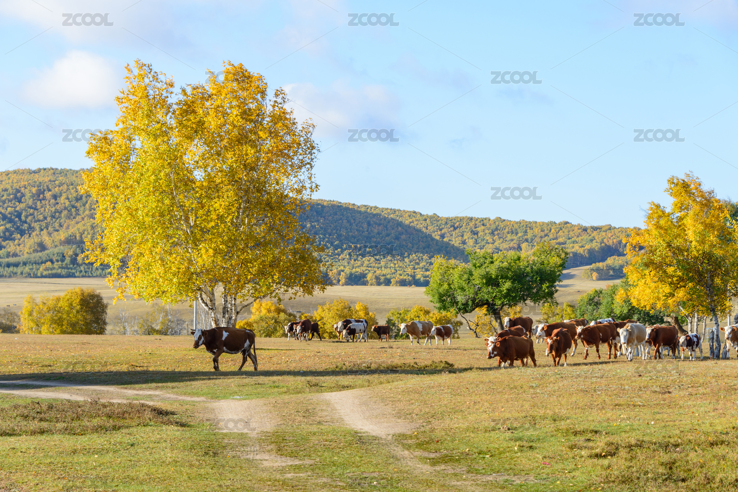中国内蒙古赤峰乌兰布统景区的金秋牧牛图
