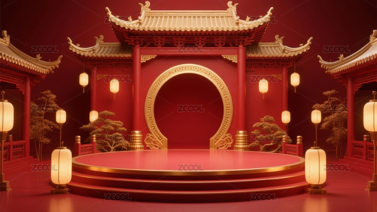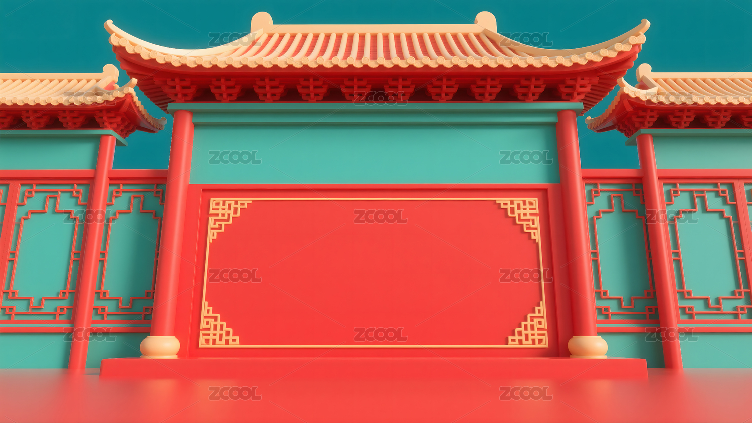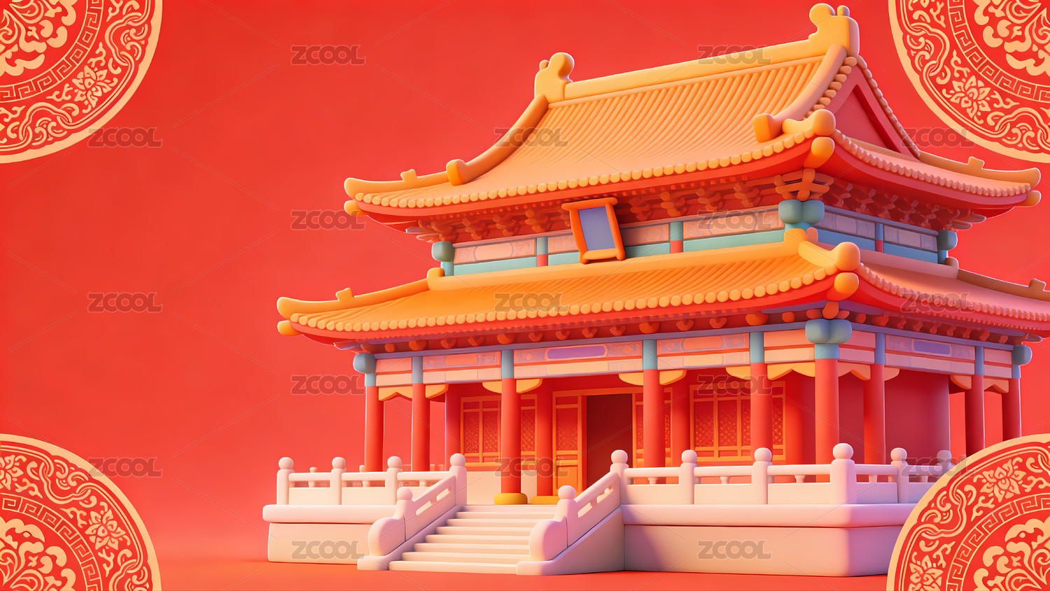 红底,描金,中国风,建筑,古风,喜庆,贺卡