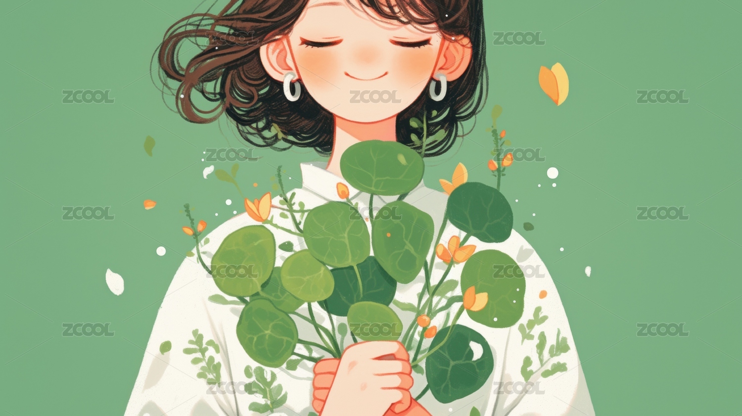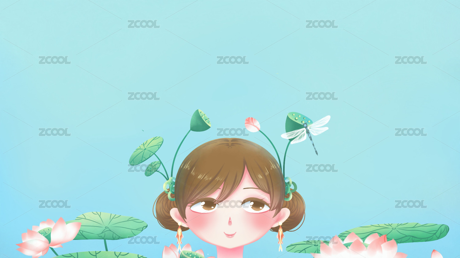 女孩与荷花,蓝色唯美夏季你好、节气插画